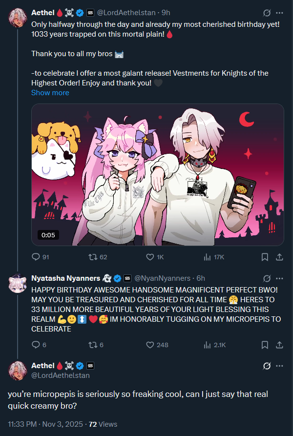 Straight Into My Veins EditionWelcome to /xvsj+/! A thread to discuss vtubers who were once associated with a hot pink company.Geega is LIVE! And is still playing The Seance of Blake Manor. She's really getting into it. Also she's in Charlie's room now instead of Caseoh's so that's fun. That's all that's happening for now so pick a stream and keep things comfy and civil by ignoring and especially reporting bait, and being excellent to each other.Image source: https://x.com/kurumahu_01/status/1983915139683512453/xvsj+/ includes:Amalee - https://www.twitch.tv/leeandlieFroot - https://www.twitch.tv/apricotGeega - https://www.twitch.tv/geegaHaruka - https://www.twitch.tv/harukakaribuHenya - https://www.twitch.tv/henyathegeniusHestia - https://www.twitch.tv/hestiahappinessHime - https://www.twitch.tv/hajimeHotaru - https://www.twitch.tv/akatsukidhotaruKson - https://www.twitch.tv/ksonsouchouKuro - https://www.twitch.tv/k9kuroMata - https://www.twitch.tv/matarakanMel - https://www.twitch.tv/projektmelodyMichi - https://www.twitch.tv/michimochieveeMomo - https://www.twitch.tv/momoMouse - https://www.twitch.tv/ironmouseNagi - https://www.twitch.tv/NagIsekaiedNazuna - https://www.twitch.tv/amemiyanazunaNyan - https://www.twitch.tv/nyannersPeke - https://www.twitch.tv/pekeispeakSilver - https://www.twitch.tv/silvervaleVei - https://www.twitch.tv/veiZen - https://www.twitch.tv/zentreyaThe BeastiezBeri - https://www.twitch.tv/beribugPia - https://www.twitch.tv/piapiufoTori - https://www.twitch.tv/toriorianeThe IdolsMint - https://www.youtube.com/@mintfantomeFeebee - https://www.twitch.tv/feebeeVicky - TBARelated:/999/ + /総長/ + /nova/ + /voms/ for Japanese talents once associated with a hot pink company/lig/ and /big/ for more generalized + and friends discussionPrevious thread: >>106296693