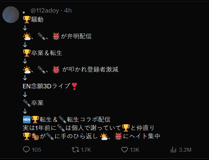 Why are the diehard Nijisisters freaking out suddenly? It was such a minuscule portion of the entire stream and it was mostly the two catching up and having fun. Not to mention that it wasn't like they went into explicit detail and were actively fanning the flames of the situation like>Matara>Quinn>Marie>tons of other ex-corpo chuubas, not from NijiEN either but in generalThere was very little to work with as fuel for dramachuubas.