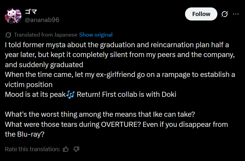 >>106325964When did Mikeneko say anything about Cover/hololive, or gather with other ex graduates?She hasn't even publicly said shit about the holos we know she hates.