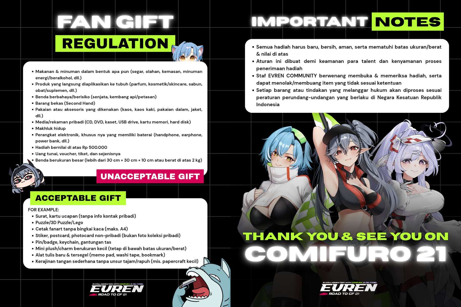 >>106357345EVREN posted a guideline for fangift.https://x.com/EVRENCommunity/status/1985925631478202528You can check the detailed rules in picrel.