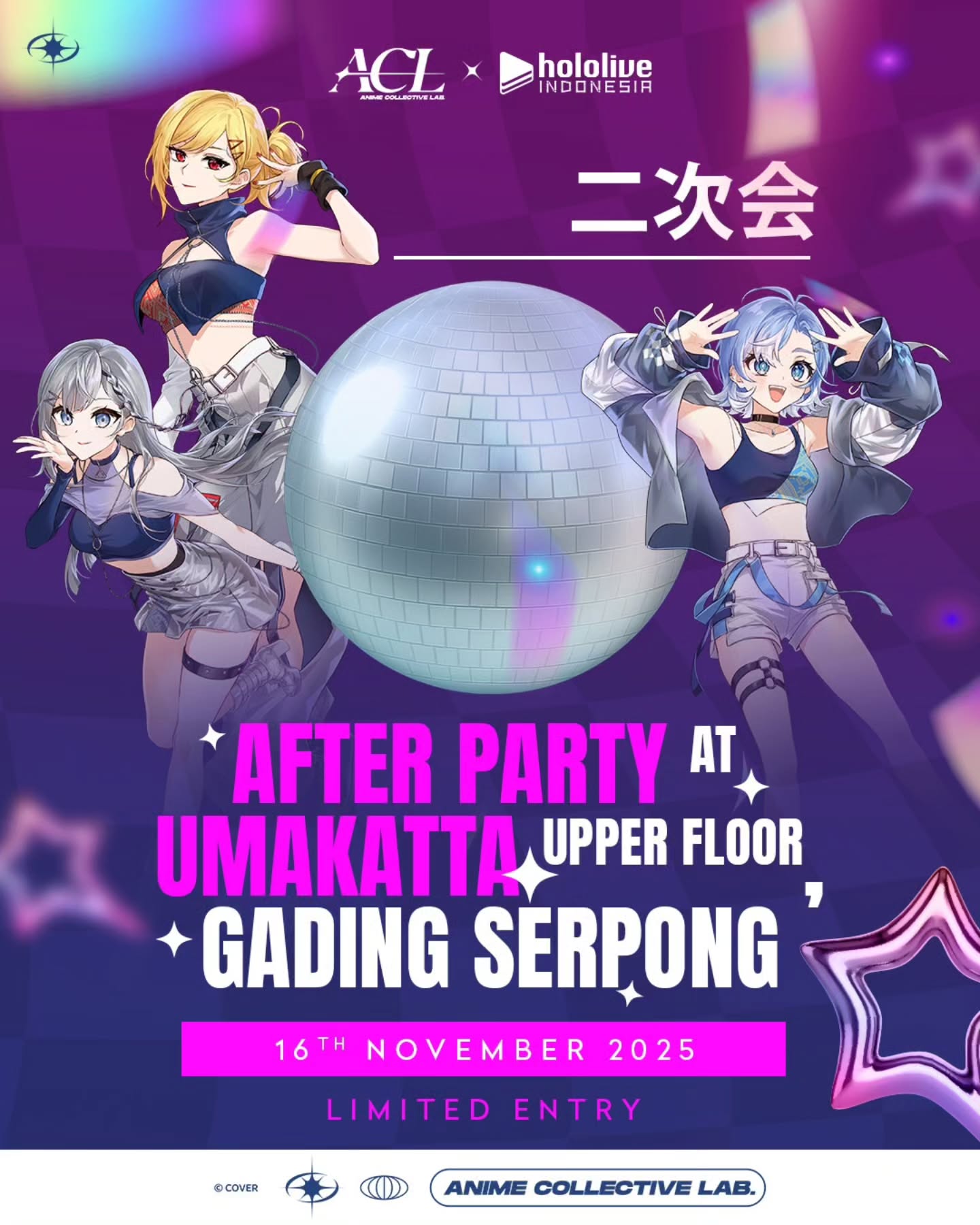 >>106357345ACL posted schedule for their HoloID collab activities.https://www.instagram.com/p/DQtjPsdEgmP/Events included are the Pop Up Show @ CF, Collab Restaurant, and a DJ After Party @ Umakatta.