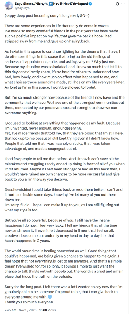 Sayu upset that she doesn't get to come back to thunderous applause and pats on the back like red boy did with Dokihttps://x.com/sayusyn/status/1986097586928042430