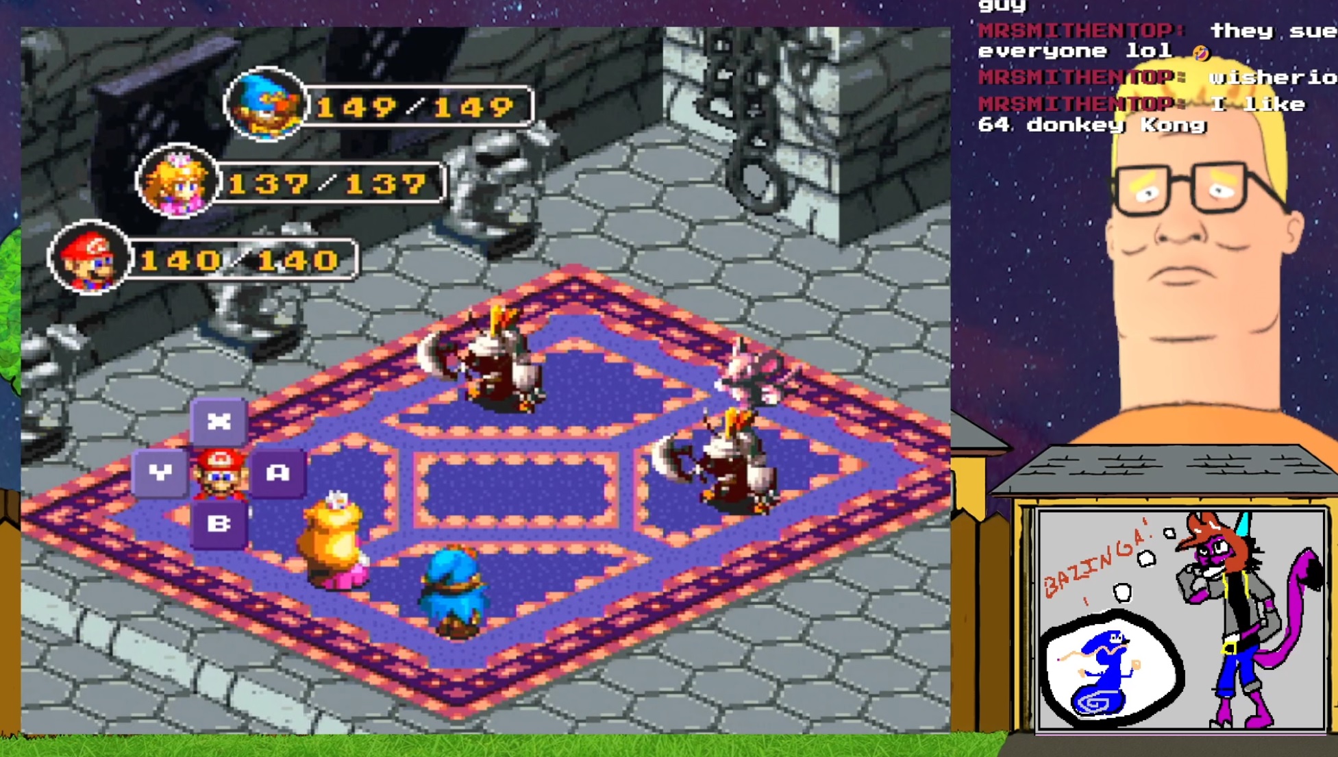 Hank Hill is playing Super Mario RPGhttps://www.twitch.tv/thegoodjared