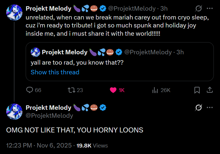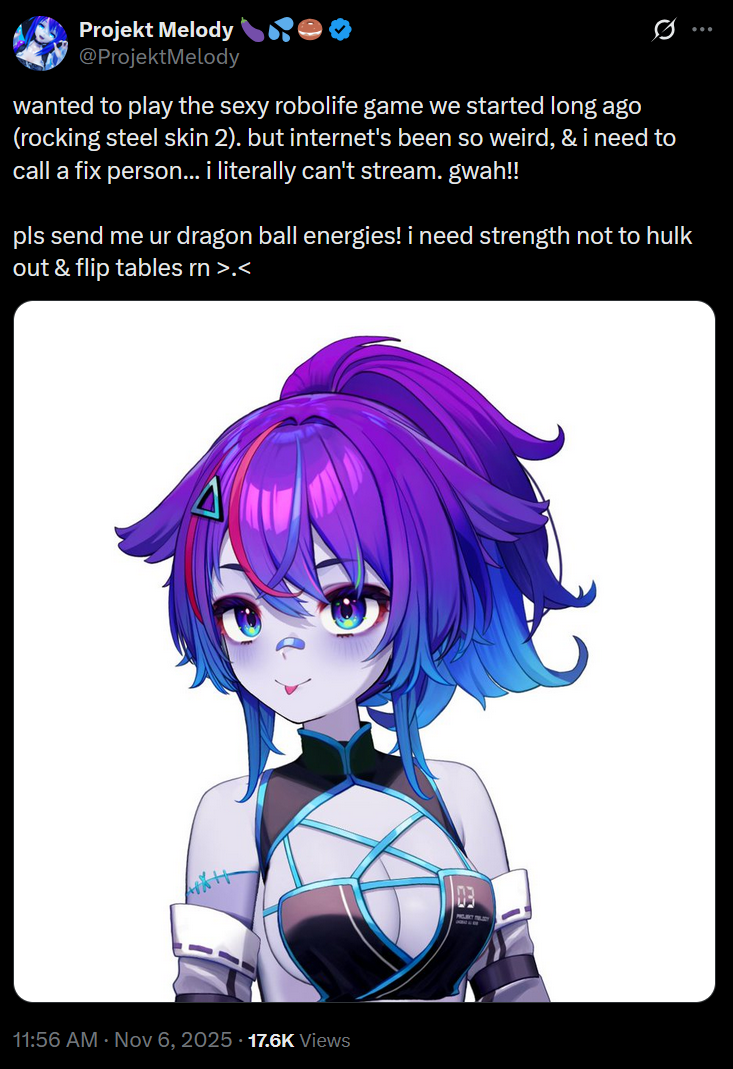 https://x.com/ProjektMelody/status/1986492950294221212The world is conspiring against Mel so I guess no Mel stream tonight.
