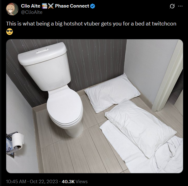>>106395203It turns out her roommate for the hotel snores, so Clio had to sleep in the bathroom or get no sleep at all. She's said that if there's any sort of work trip in the future, she'll get her own room even if she has to pay for it herself.