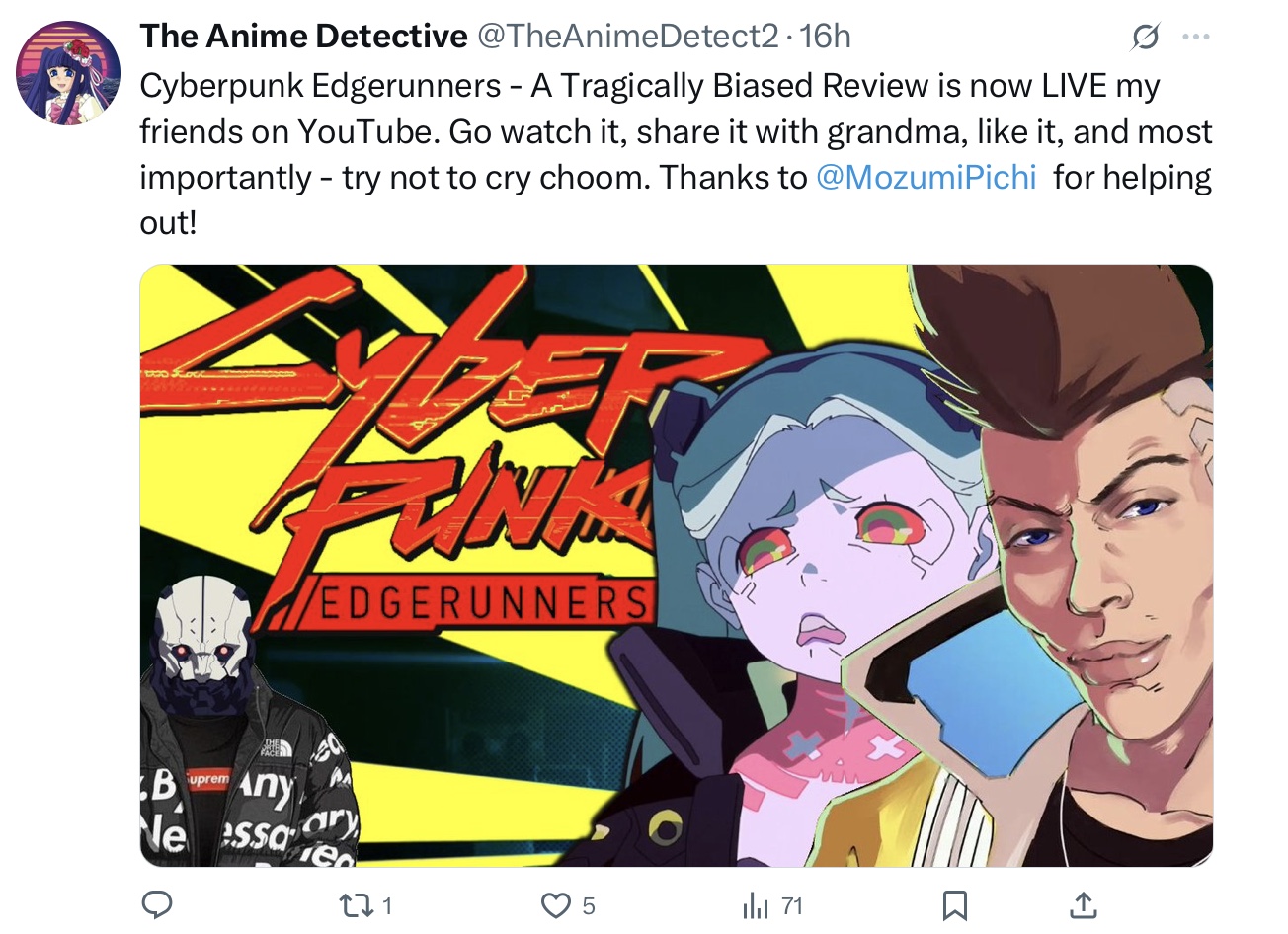 also cyberpunk sucks ass, both the game and the anime. hang trigger fans.