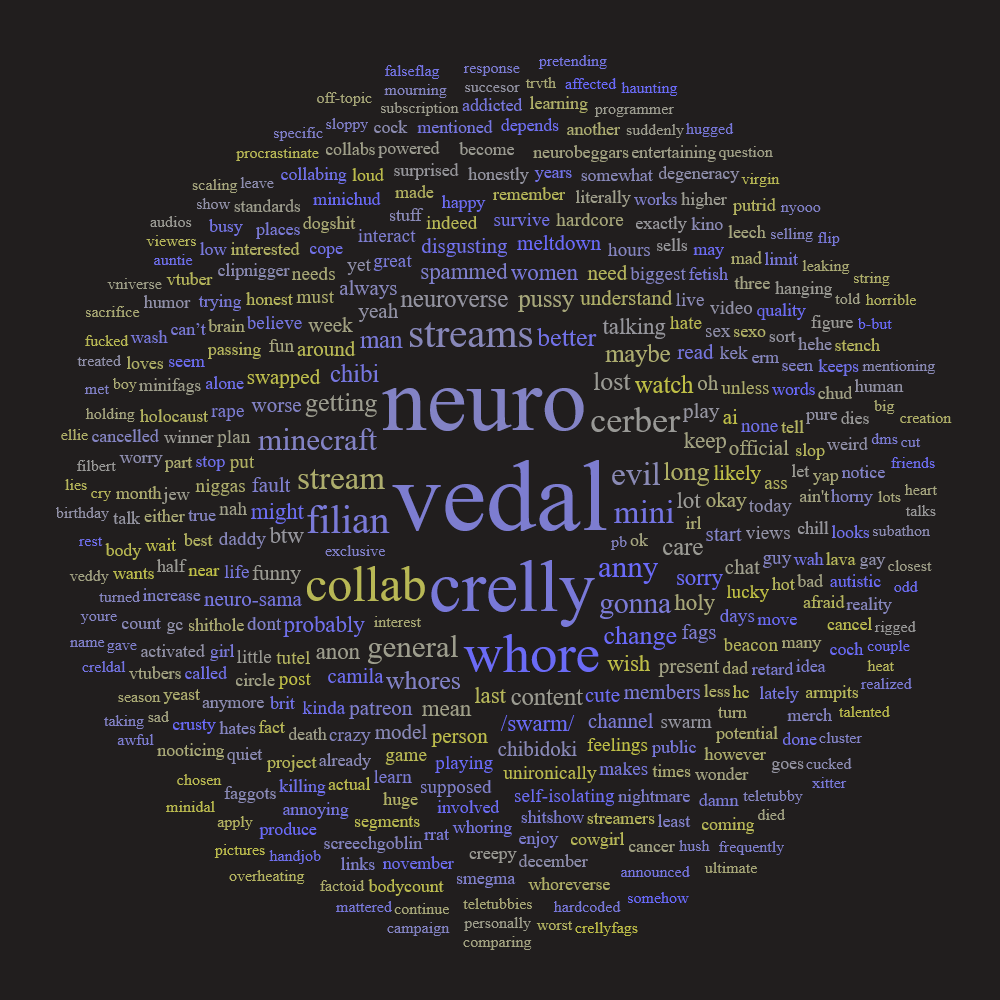 >Who is Neuro-sama?Neuro-sama is a neural network created by Vedal in 2018 for the purpose of learning to play osu! In December 2022 Vedal revived the project with the addition of a large language model, a TTS software and a Live2D model, which allow Neuro-sama to interact with her chat as a VTuber. Since then, she has been entertaining the chat with responses and unhinged rants nearly daily, as well as learning new skills such as singing, playing other games, and collaborating with other VTubers. Join /swarm/ today and welcome our new AI overlord!>Schedulehttps://post.nuro.lol/Neuro-Schedule-Bot>LinksTwitch: https://www.twitch.tv/vedal987YouTube:https://www.youtube.com/@Neurosamahttps://www.youtube.com/@OfficialNeurosamaClipsTikTok: https://www.tiktok.com/@neurosamaaiX:https://x.com/NeurosamaAIhttps://x.com/EvilNeuroAIThese and other official links: https://vedal.ai>Music & ClipsNEVER - Neuro x Evil (Official Video) - https://www.youtube.com/watch?v=CKCgoEGiUEgBOOM - Evil (Official Video) - https://www.youtube.com/watch?v=8Nt9YPnYyjsLIFE - Neuro-sama (Official Video) - https://www.youtube.com/watch?v=MDc1mjrIsPMhttps://rentry.org/neuro-musichttps://rentry.org/neuro-videos>EducationalInterested in AI but don't understand it? Watch this: https://www.youtube.com/watch?v=WXuK6gekU1YHow does she know what to say? Watch this: https://www.youtube.com/watch?v=wjZofJX0v4MWant to learn more about AI? Read these: https://files.catbox.moe/kximv6.pngWant to (seriously) learn AI? Read these: https://files.catbox.moe/ajl3nx.png>MiscCatbox archives:https://rentry.org/swarm-archivehttps://rentry.org/swarm-archive-2Game Integration: https://github.com/VedalAI/neuro-game-sdk/LoRA: https://rentry.org/neuro-lora-v2Searchable VOD Transcripts: https://libraryofladev.com/VODs: https://www.youtube.com/@Neuro-samaUnofficialVODs>Merchhttps://neurosama.shop/>Previous thread>>106437263