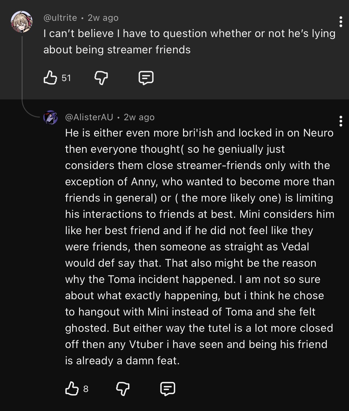 >>106453926Big boy Vedal is going to start watching Hololive VTubers now instead of his 3views orbiters