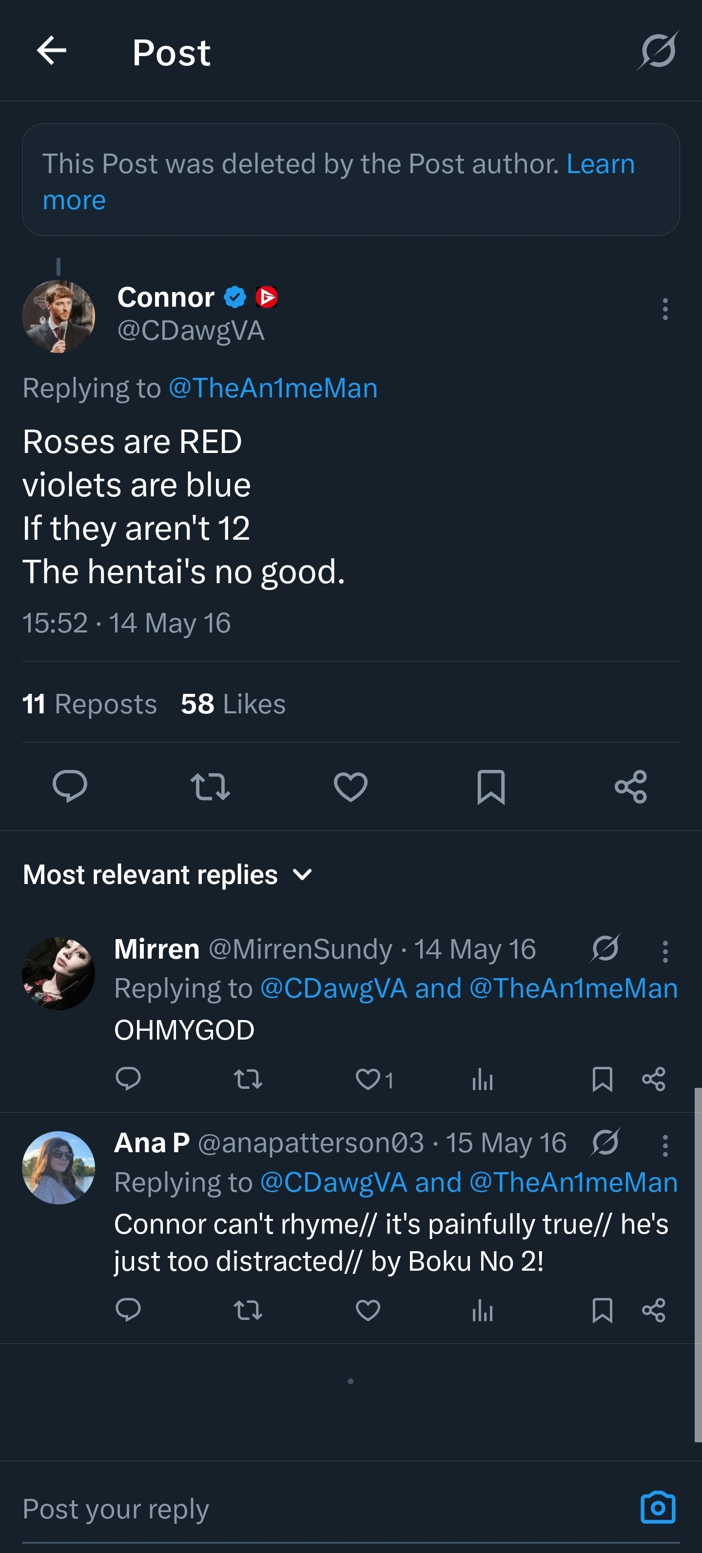 >>106464659Connorsperg dug up a 10 year old tweet about lolis and is crashing out because noone cares