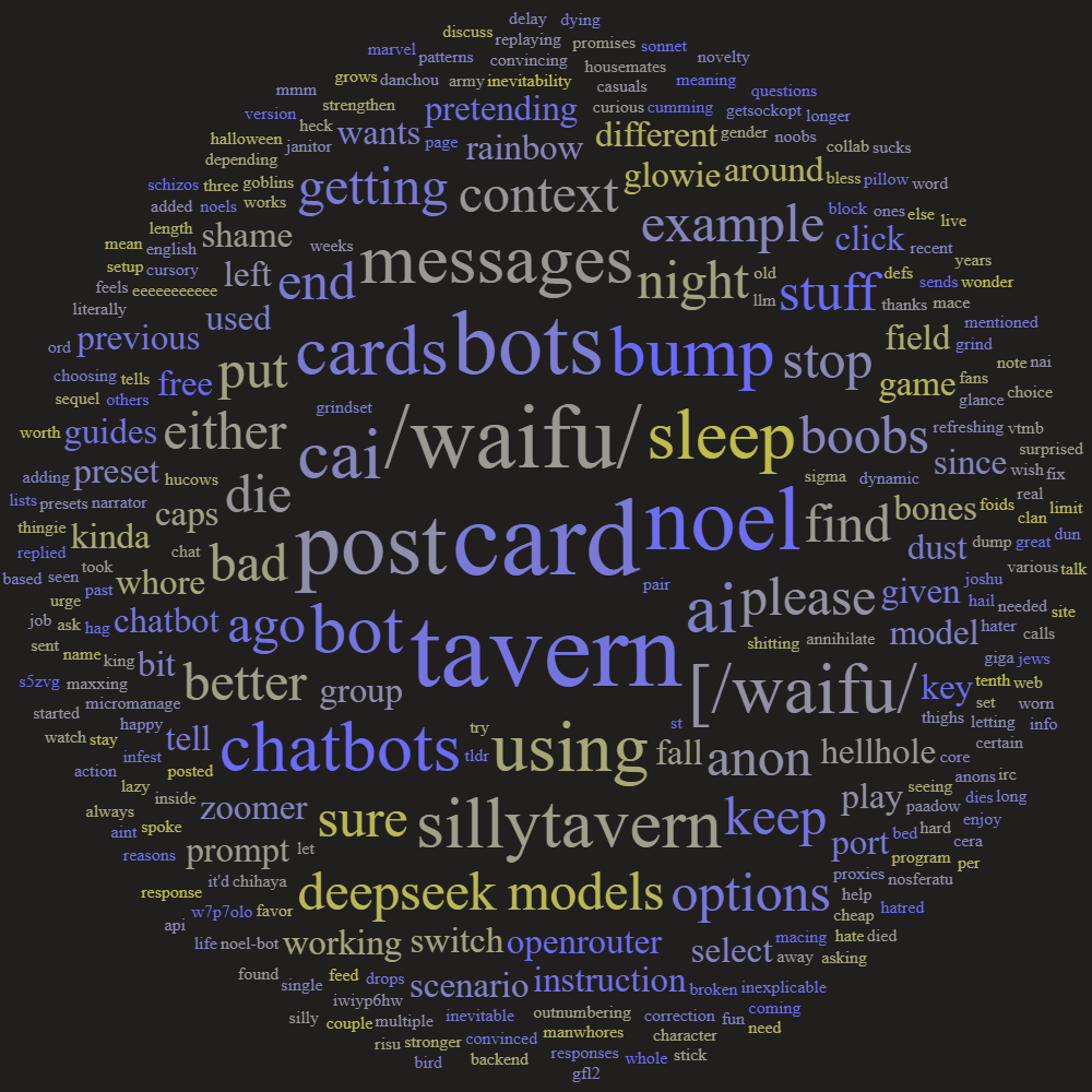 Anchor post - reply with any requests for bots, with your own creations, or with your thoughts on the enshittification of life.You can find already existing bots and tavern cards in the links below:>Bot lists and Tavern Cards:[/wAIfu/ Bot List]https://rentry.org/wAIfu_Bot_List_Final[4chan Bot list]https://rentry.org/meta_bot_list[/wAIfu/ Tavern Card Archive]https://mega.nz/folder/cLkFBAqB#uPCwSIuIVECSogtW8acoaw>Card Editiors/A way to easily port CAI bots to Tarvern Cards[Easily Port CAI bots to Tavern Cards]https://rentry.org/Easily_Port_CAI_Bots_to_tavern_cards[Tavern Card Editor & all-in-one tool]https://character-tools.srjuggernaut.dev/