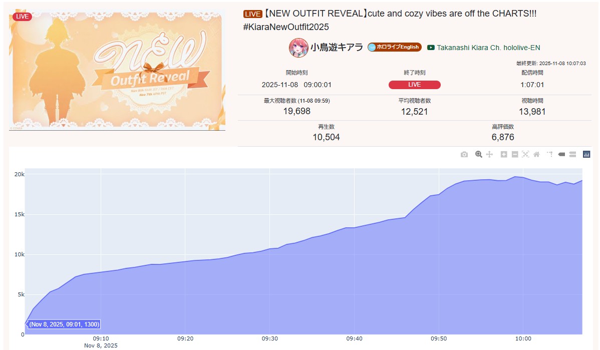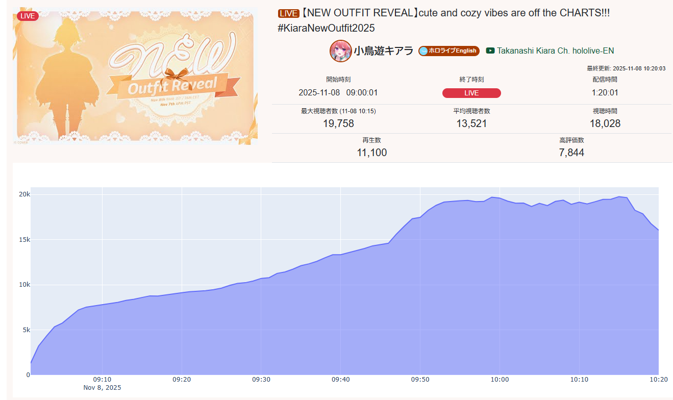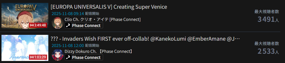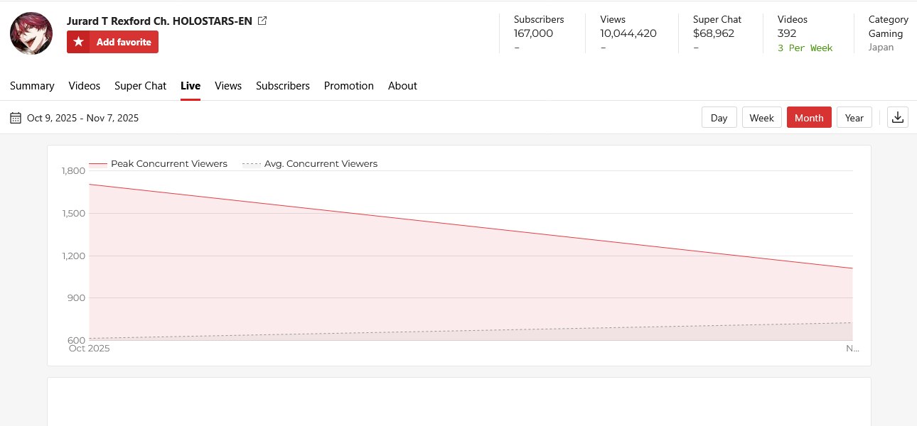 >>106450262NOV 2025 EN SILVER11/1 - Bijou - Halloween 3D VRChat: 8,81511/2 - Bijou - 3D Live: 39,72611/3 - Elizabeth - Girls' Night: 13,38711/4 - Dokibird - Second Black Stream: 15,18211/5 - Cecilia - Girls' Night: 9,54511/6 - Calliope - Devil May Cry 5: 9,40911/7 - Kaelix - Birthday: 7,404PER COMPANY5x: Hololive English1x: Indie1x: Nijisanji EnglishPER STREAMER2x: Bijou1x: Calliope, Cecilia, Elizabeth, Dokibird, Kaelix