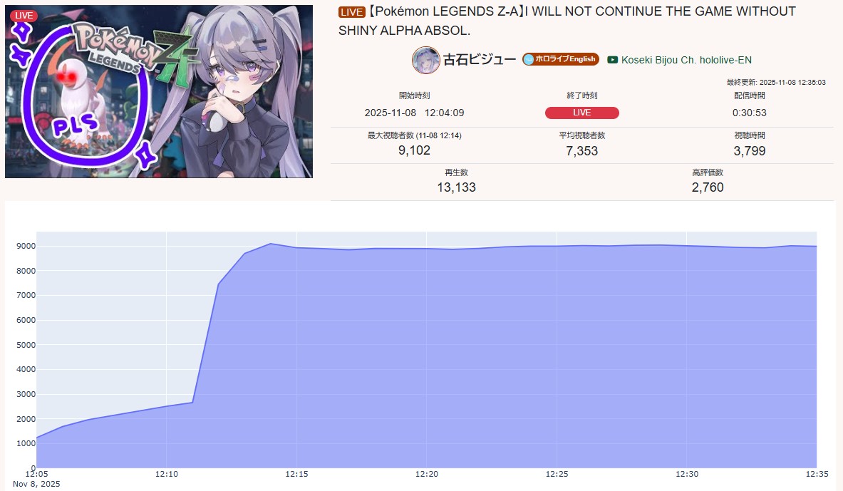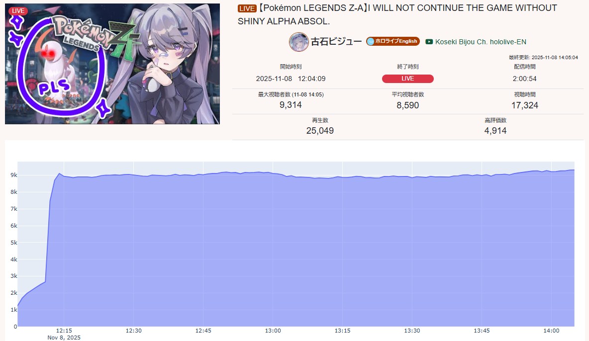 >>106450216NOV 2025 EN GOLD11/1 - Saba - Halloween 3D VRChat: 14,06011/2 - Calliope - Devil May Cry 4: 112,76711/3 - Saba - Archived Karaoke: 22,67211/4 - Peo - Minecraft: 34,48311/5 - IRyS - Sekiro Shadows Die Twice: 10,72611/6 - Gigi - Unarchived Karaoke: 9,96311/7 - Meloco - GTA V: 7,962PER COMPANY3x: Hololive English3x: Indie1x: Nijisanji EnglishPER STREAMER2x: Saba1x: Gigi, IRyS, Peo, Calliope, Meloco