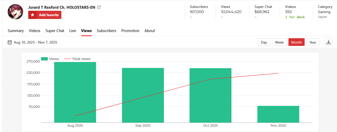 >>106450295NOV 2025 EN BRONZE11/1 - Gigi - Halloween VRChat: 7,68811/2 - Gigi - Accessory Reveal: 22,05511/3 - Calliope - Unarchived Karaoke: 12,36611/4 - Gigi - Girls' Night: 12,60611/5 - Bijou - Dead Space 2: 9,01211/6 - Raora - Girls' Night: 6,76411/7 - Ina'nis - Pokemon Legends Z-A: 7,312PER COMPANY7x: Hololive EnglishPER STREAMER3x: Gigi1x: Ina'nis, Calliope, Raora, Bijou
