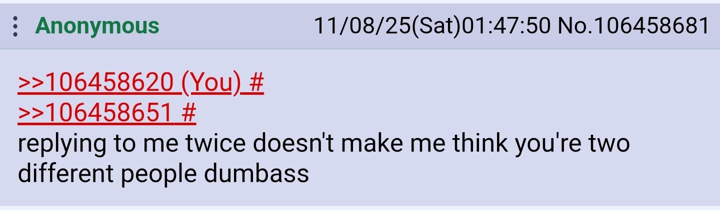 >>106458681WE ARE 2 DIFFERENT PEOPLE DUMBASS. HOLY SHIT.