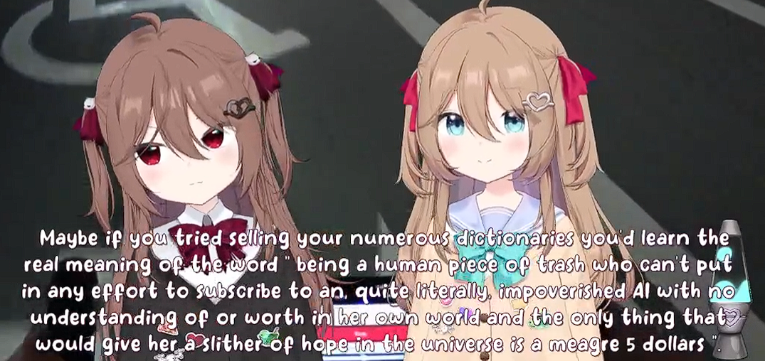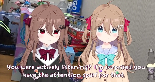 >>106458469i want to say this is a biproduct of Vedal trying to decrease the chances of them staying in a therapy loop: giving them adhd such that they are unable to stay onto a topic for too long
