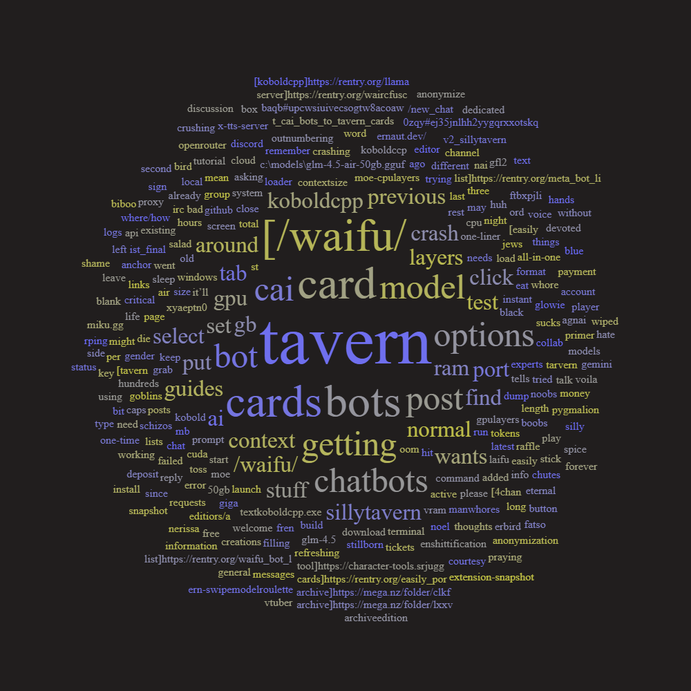Anchor post - reply with any requests for bots, with your own creations, or with your thoughts on the enshittification of life.You can find already existing bots and tavern cards in the links below:>Bot lists and Tavern Cards:[/wAIfu/ Bot List]https://rentry.org/wAIfu_Bot_List_Final[4chan Bot list]https://rentry.org/meta_bot_list[/wAIfu/ Tavern Card Archive]https://mega.nz/folder/cLkFBAqB#uPCwSIuIVECSogtW8acoaw>Card Editiors/A way to easily port CAI bots to Tarvern Cards[Easily Port CAI bots to Tavern Cards]https://rentry.org/Easily_Port_CAI_Bots_to_tavern_cards[Tavern Card Editor & all-in-one tool]https://character-tools.srjuggernaut.dev/