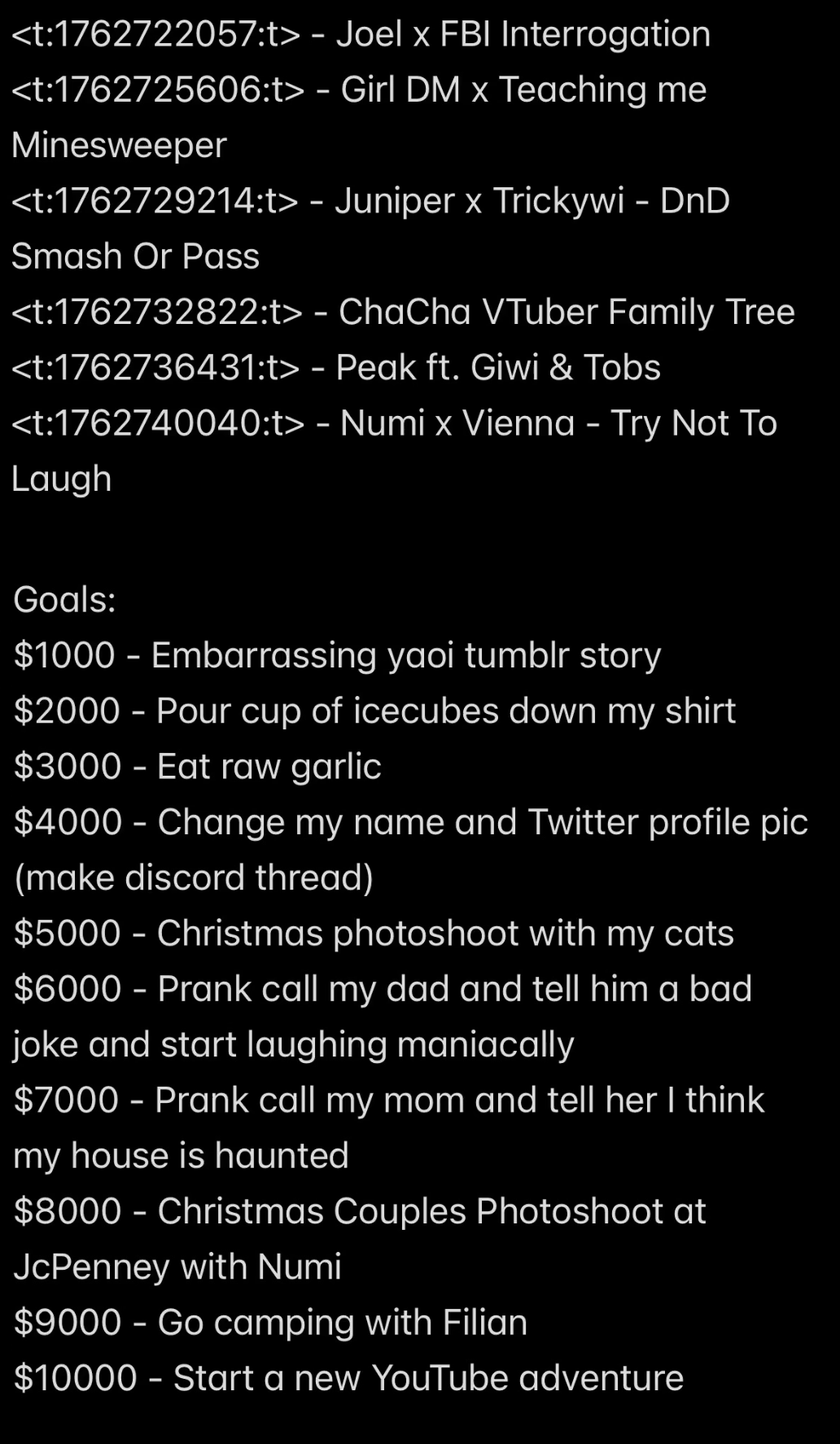 >>106507352Looks like it was meant to be posted in Discord but she never did that she just showed a screenshot of a phone notepad>>106507369>>106507404I imagine it will be Filian walking around in her setup watching Bao try to camp
