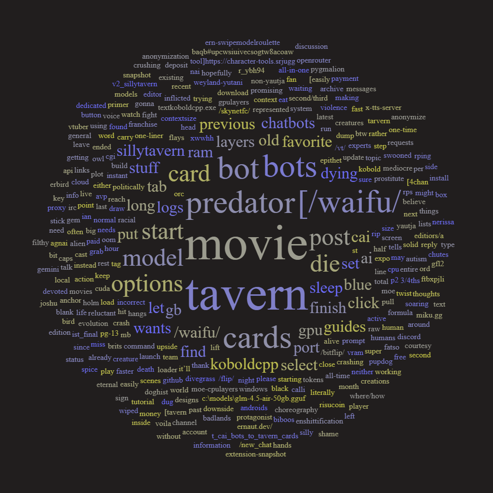 Anchor post - reply with any requests for bots, with your own creations, or with your thoughts on the enshittification of life.You can find already existing bots and tavern cards in the links below:>Bot lists and Tavern Cards:[/wAIfu/ Bot List]https://rentry.org/wAIfu_Bot_List_Final[4chan Bot list]https://rentry.org/meta_bot_list[/wAIfu/ Tavern Card Archive]https://mega.nz/folder/cLkFBAqB#uPCwSIuIVECSogtW8acoaw>Card Editiors/A way to easily port CAI bots to Tarvern Cards[Easily Port CAI bots to Tavern Cards]https://rentry.org/Easily_Port_CAI_Bots_to_tavern_cards[Tavern Card Editor & all-in-one tool]https://character-tools.srjuggernaut.dev/
