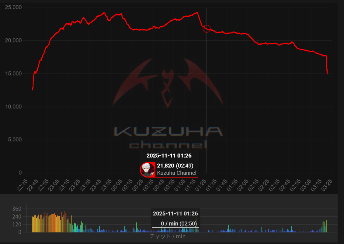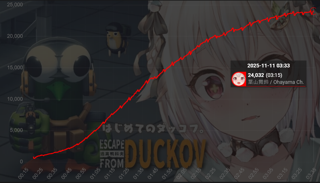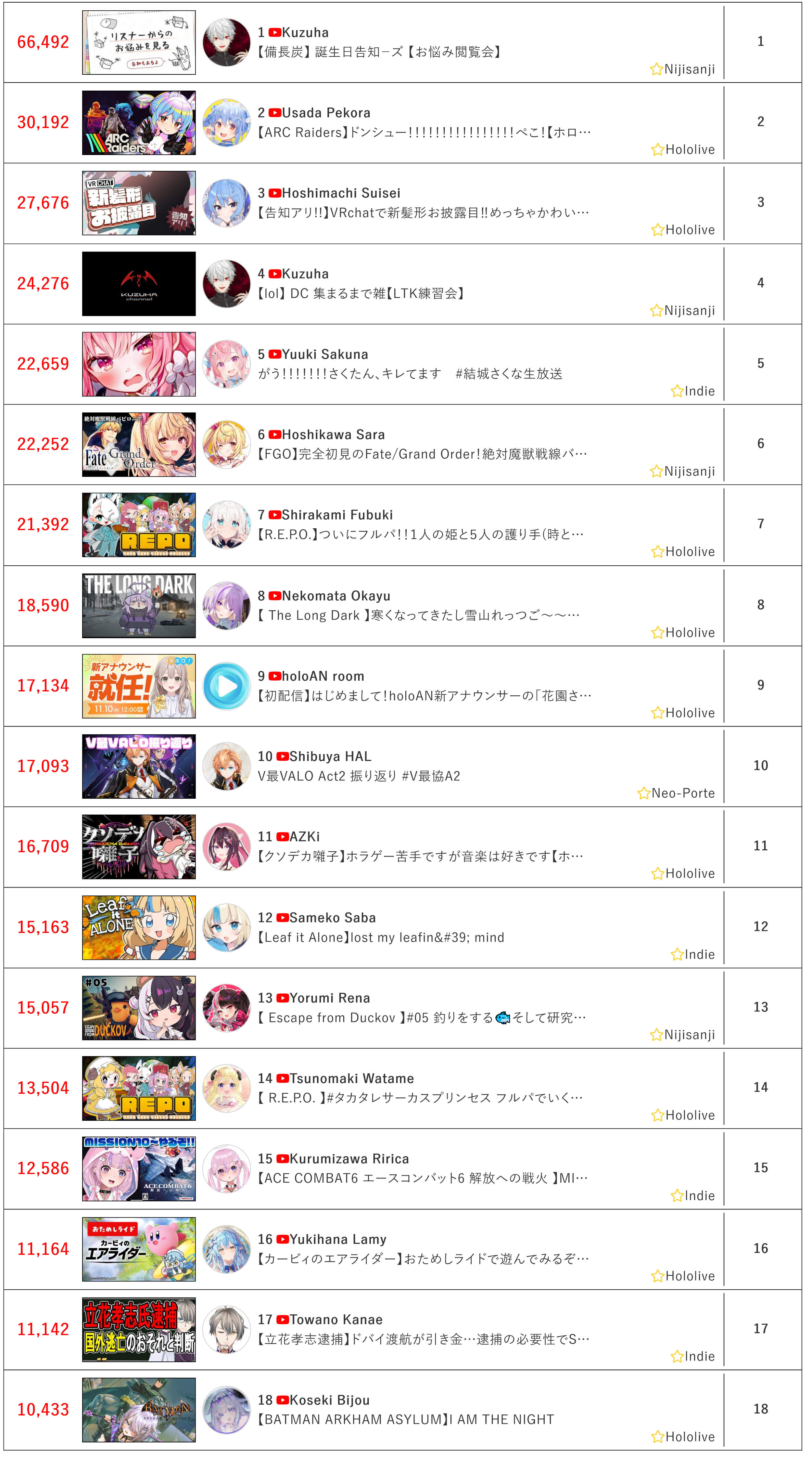 * FINAL TALLY OF THE DAY IS IN *Here it goes>66,492: Kuzuha (Nijisanji)>30,192: Pekora (Hololive)>27,676: Suisei (Hololive)>24,276: Kuzuha (Nijisanji)>22,659: Sakuna (Indie)>22,252: Hoshikawa (Nijisanji)>21,392: Fubuki (Hololive)>18,590: Okayu (Hololive)>17,134: holoAN room (Hololive)>17,093: Hal (Neo-Porte)>16,709: AZKi (Hololive)>15,163: Saba (Indie)>15,057: Rena (Nijisanji)>13,504: Watame (Hololive)>12,586: Ririca (Indie)>11,164: Lamy (Hololive)>11,142: Kanae (Indie)>10,433: Bijou (Hololive)Gold for Kuzuha with birthday stream with Pekora getting silver with ARC Raiders and Suisei, bronze