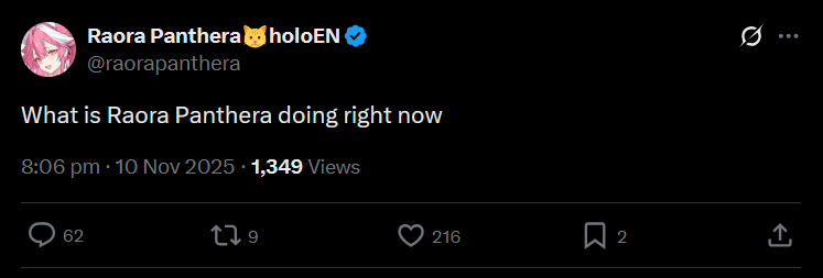 I think it's a bit funny that Shiori still mentions Mumei and sends her memes but also has not mentioned Fauna a singular time ever since the LLD.