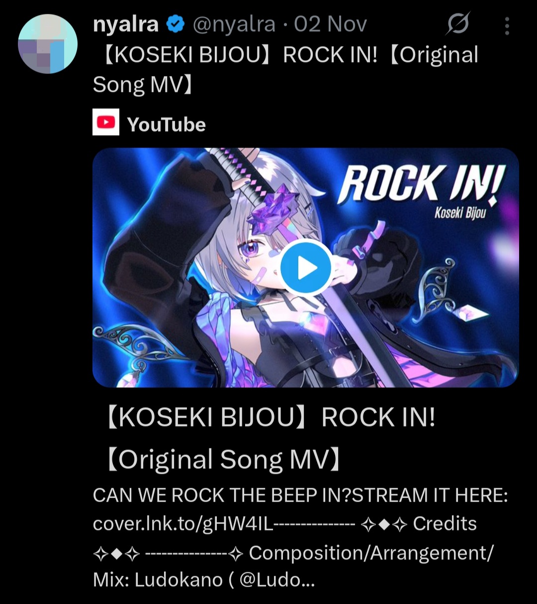 >>106537403https://youtu.be/V_oAPTIK7rIEN songs in the Hololive weekly top 100 Nov 2-Nov 8 (1st week songs excluded):>96) Prisoner (Advent) - 38,961 views>87) Kaibutsu (FUWAMOCO) - 42,729 views>85) Kira Killer (Zutomayo ft. Mori Calliope) - 43,223 views>76) Deep in Abyss. (Ninomae Ina'nis/Nanashi Mumei) - 46,745 views>70) All for One (HoloEN) - 49,257 views>67) KING (Gawr Gura/Mori Calliope) - 49,798 views>65) Love Me Love Me Love Me (Nerissa Ravencroft) - 51,513 views>63) Go-Getters (Mori Calliope) - 52,286 views>60) I'll still be here (Gigi Murin) - 54,800 views>55) Daidaidaidaidaikirai (Hakos Baelz/Ouro Kronii) - 56,612 views>38) Team Tomodachi (Advent) - 74,257 views>33) Dynamite (Nerissa Ravencroft/Aokumo Rin) - 84,470 views>19) Orpheus (Mori Calliope) - 115,670 views>17) Gehenna (IRyS/Nanashi Mumei) - 119,371 views>16) Prisoner (FUWAMOCO) - 119,503 views>12) TAKEDOWN (AmaLee/Bao/Mori Calliope) - 127,701 views>9) Ash Again (Gawr Gura) - 168,981 viewsNew:>ROCK IN! (Koseki Bijou) - 388,866 views>Free (AmaLee/Nerissa Ravencroft) - 233,978 views>LET'S JUST CRASH (Mori Calliope) - 756,276 views>Run Back 'Round (Promise) - 44,638 viewsNotes:Above/Below and Gacha Gacha fall off the list. The two Mumei covers, the Nerissa/Rin cover, and the FUWAMOCO self cover make the list in their first eligible week. Mori's Let's Just Crash was the #1 viewed Holo song last week, edging out Bibbidiba by about 20k.