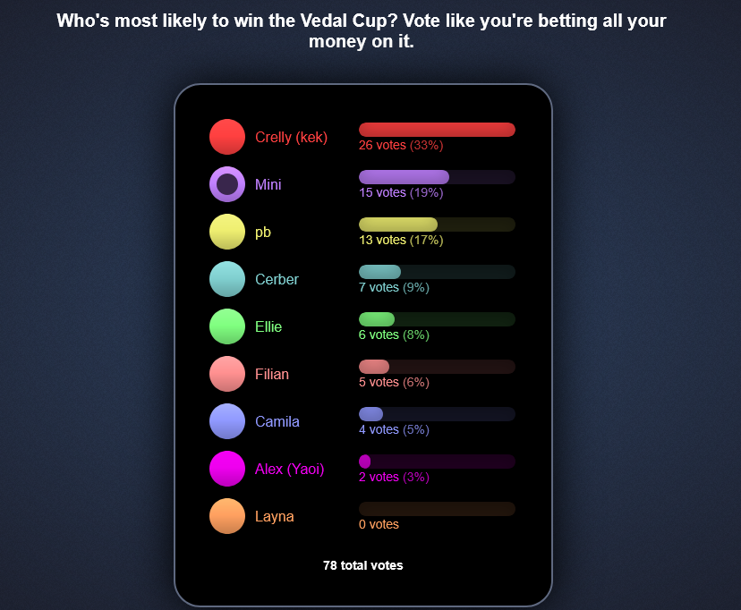 BET HERE!https://poal.me/6vrppihttps://poal.me/6vrppihttps://poal.me/6vrppiThe market is heating up! Crellycoin, who was near the bottom in terms of value in the betting season, has risen up to currently hold the n.1 spot, while Cerber and Mini have drastically fallen in value! Will the market recover, or are we in the eve of a revolution? It's too early to tell!