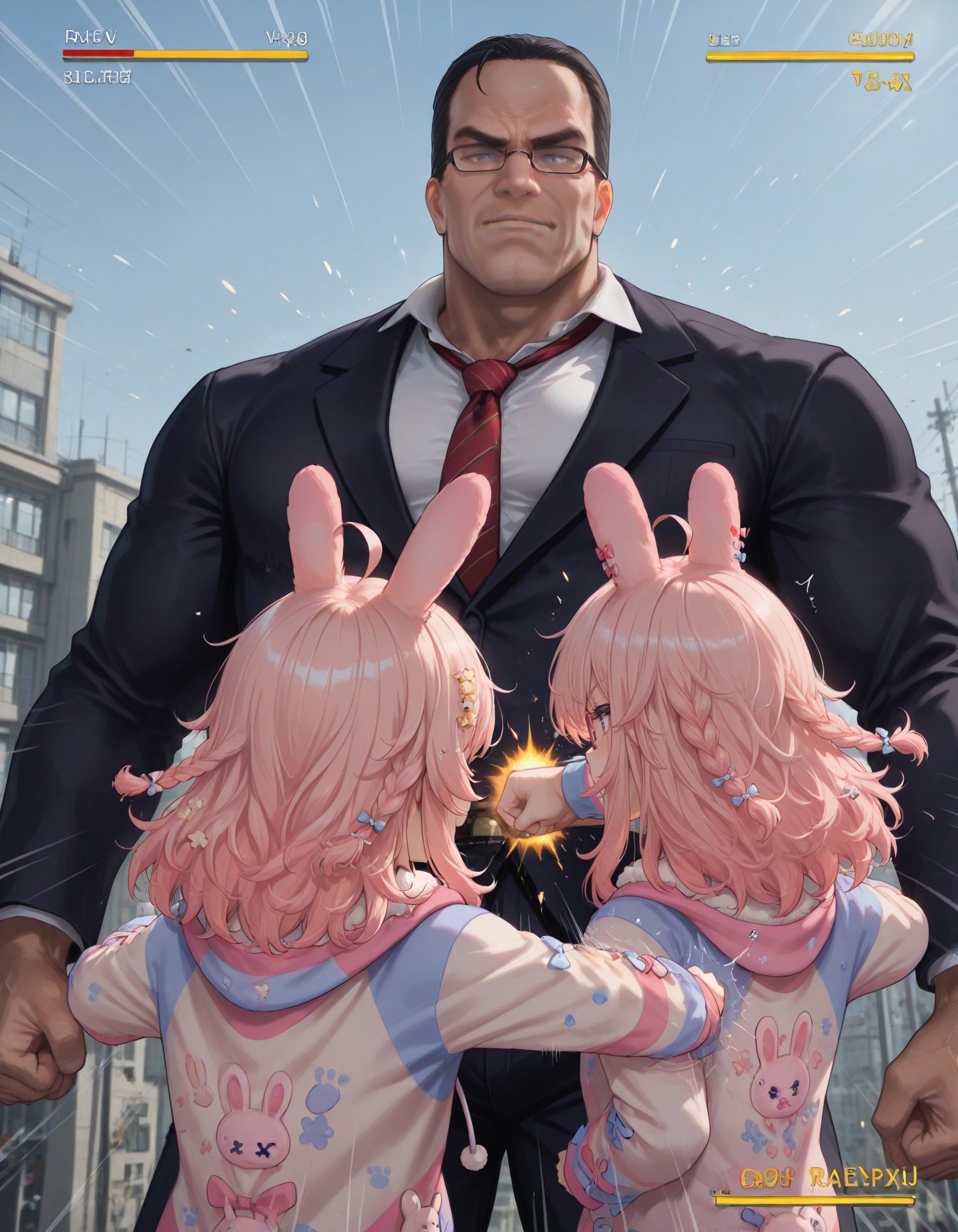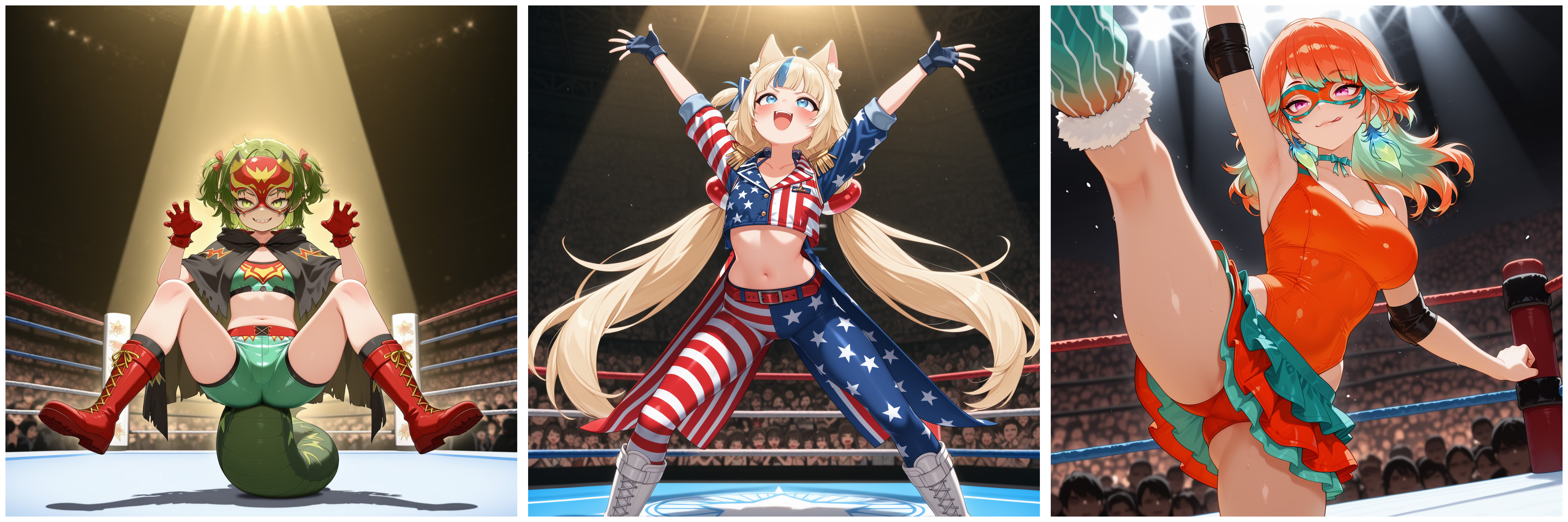 There is some new blood in the Chuuba Wrestling FederationReina Cocodrilo: https://files.catbox.moe/kc3lz2.pngThe American Chubber: https://files.catbox.moe/h247gx.pngNaranja Tornasol: https://files.catbox.moe/ezoipg.pngFull album with all wrestlers: https://catbox.moe/c/4r5apt>OPNice! I made it to op, trust me (Gets Biboo taxed)>>106551249>oh wow, that's a really nice adaptation. How did you do it?With difficulty, first a regional mask gen to set up the base characters, then inpainted the Gigi Pilot which was easy, then the BI-800 Titan which was a nightmare; I first inpainted a generic purple Titan, then I had to inpaint the Biboo crown separately and then a third inpaint to integrate the crown with the Titan. The Titanfall lora is quite hard to work with but without it it's impossible: https://civitai.com/models/1301218Also, goddamn you are prolific, good shit man