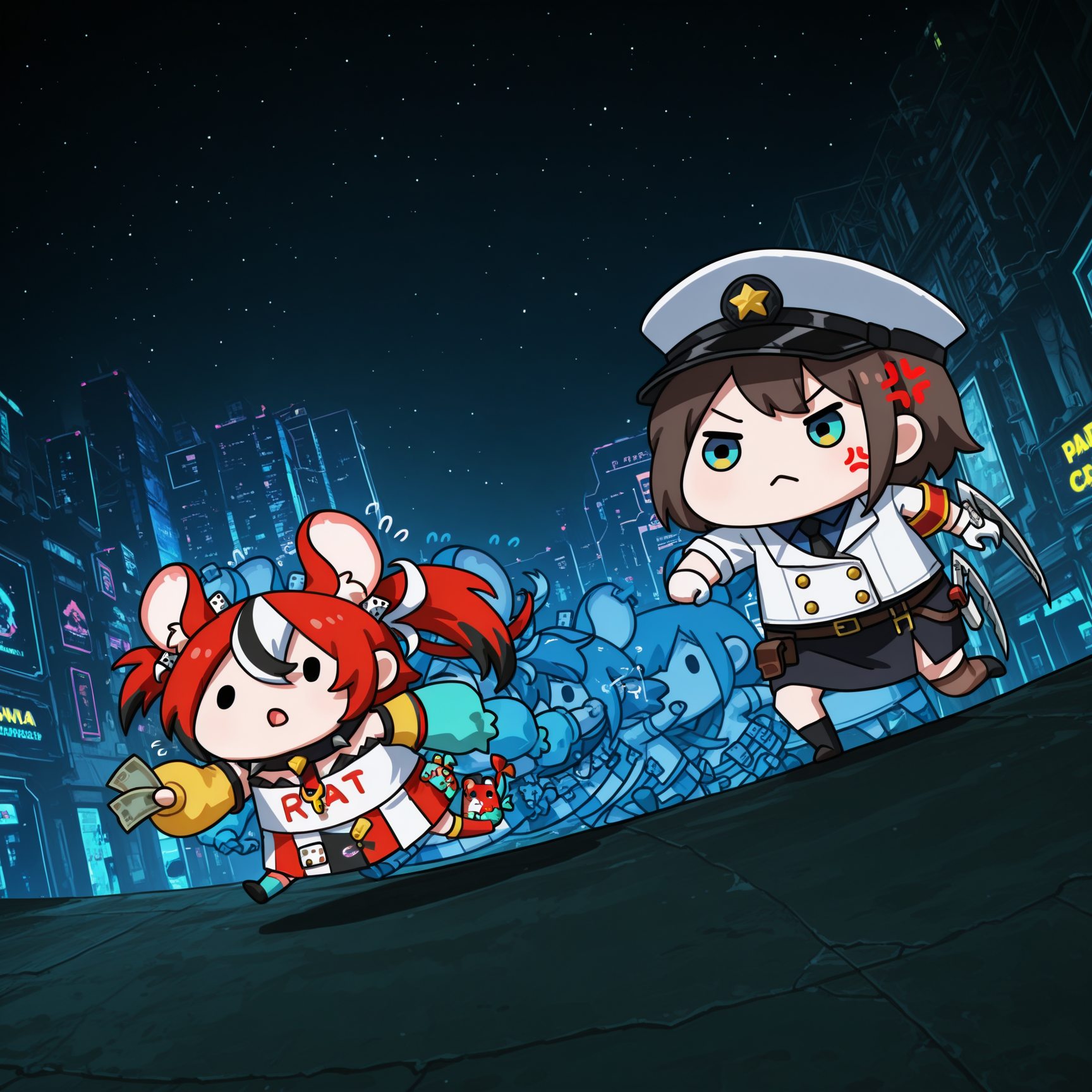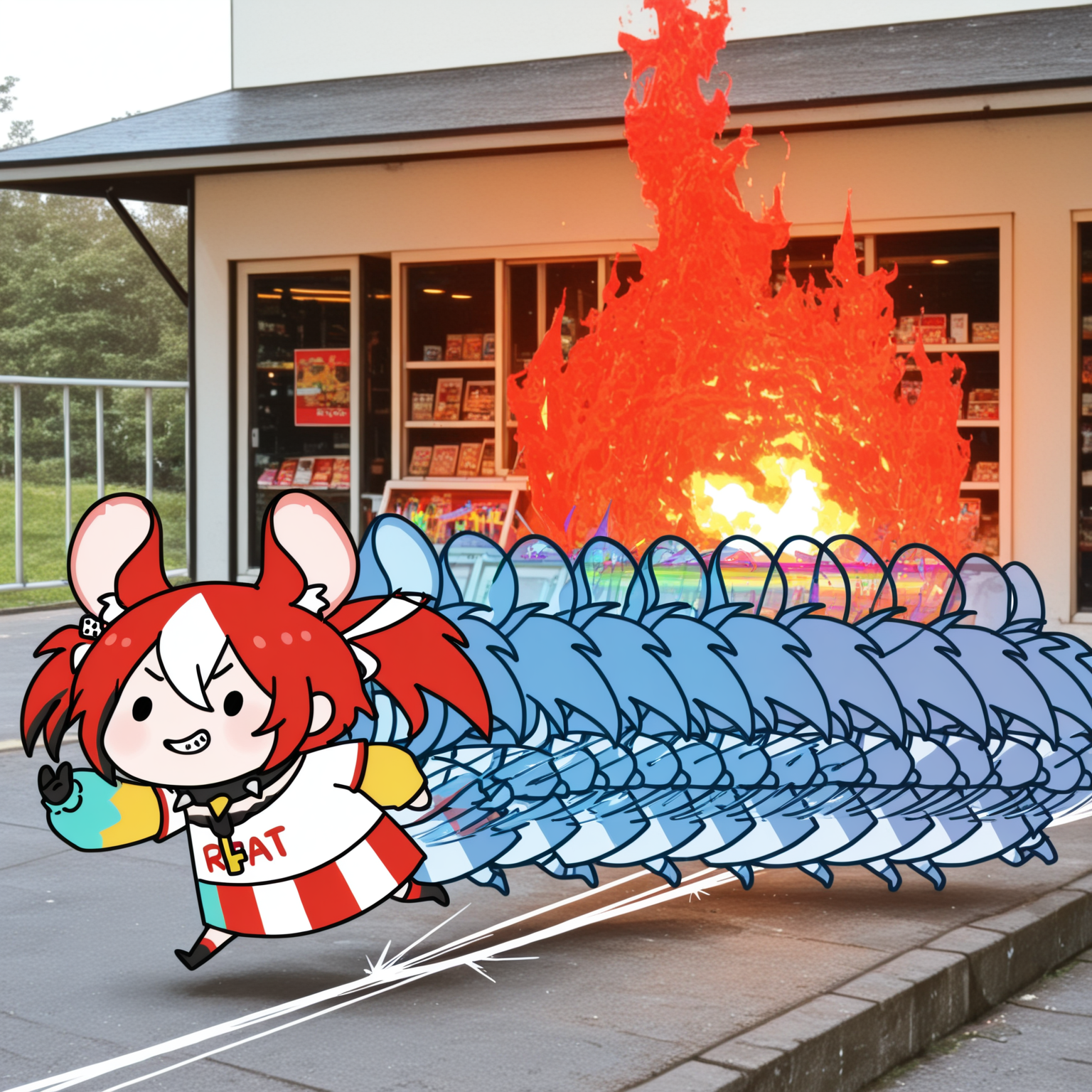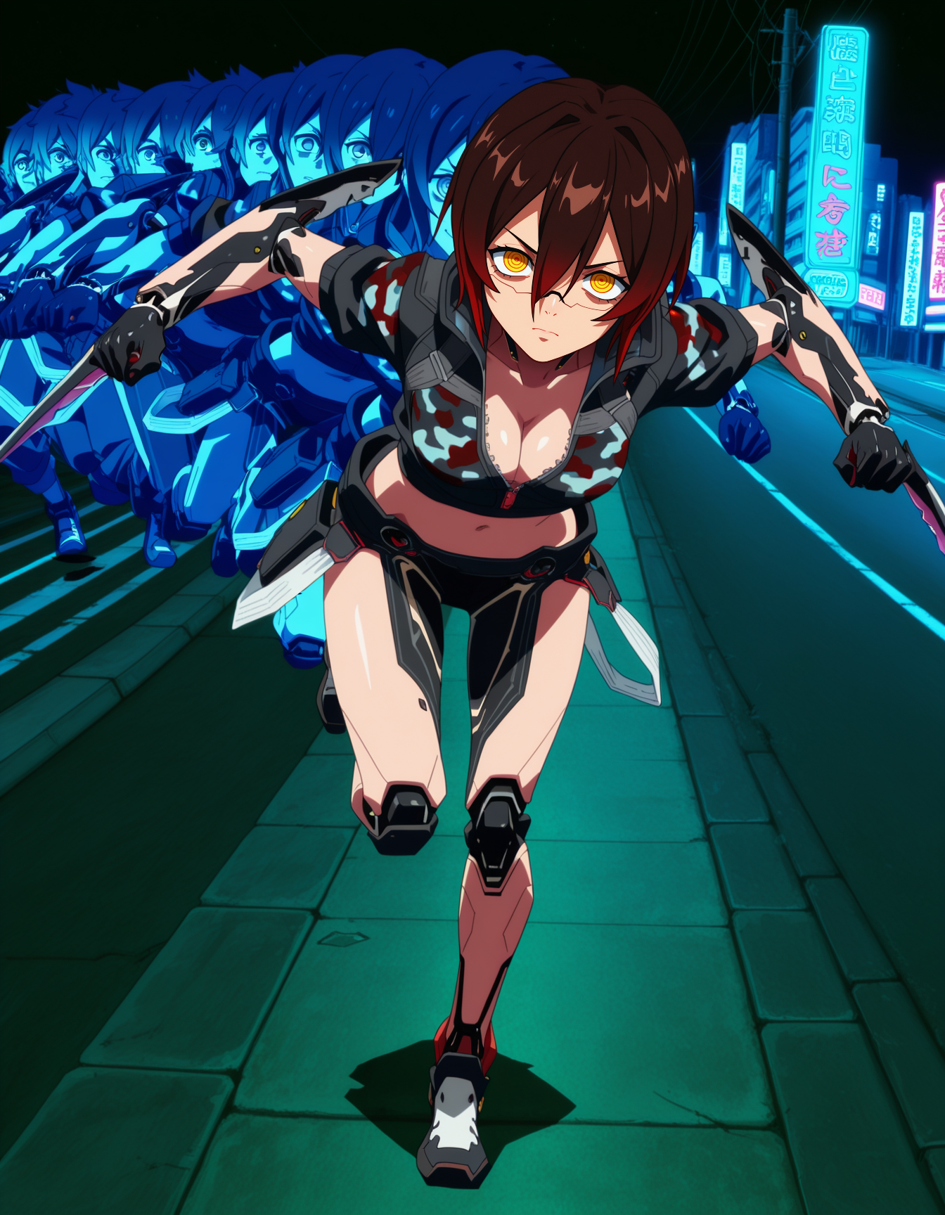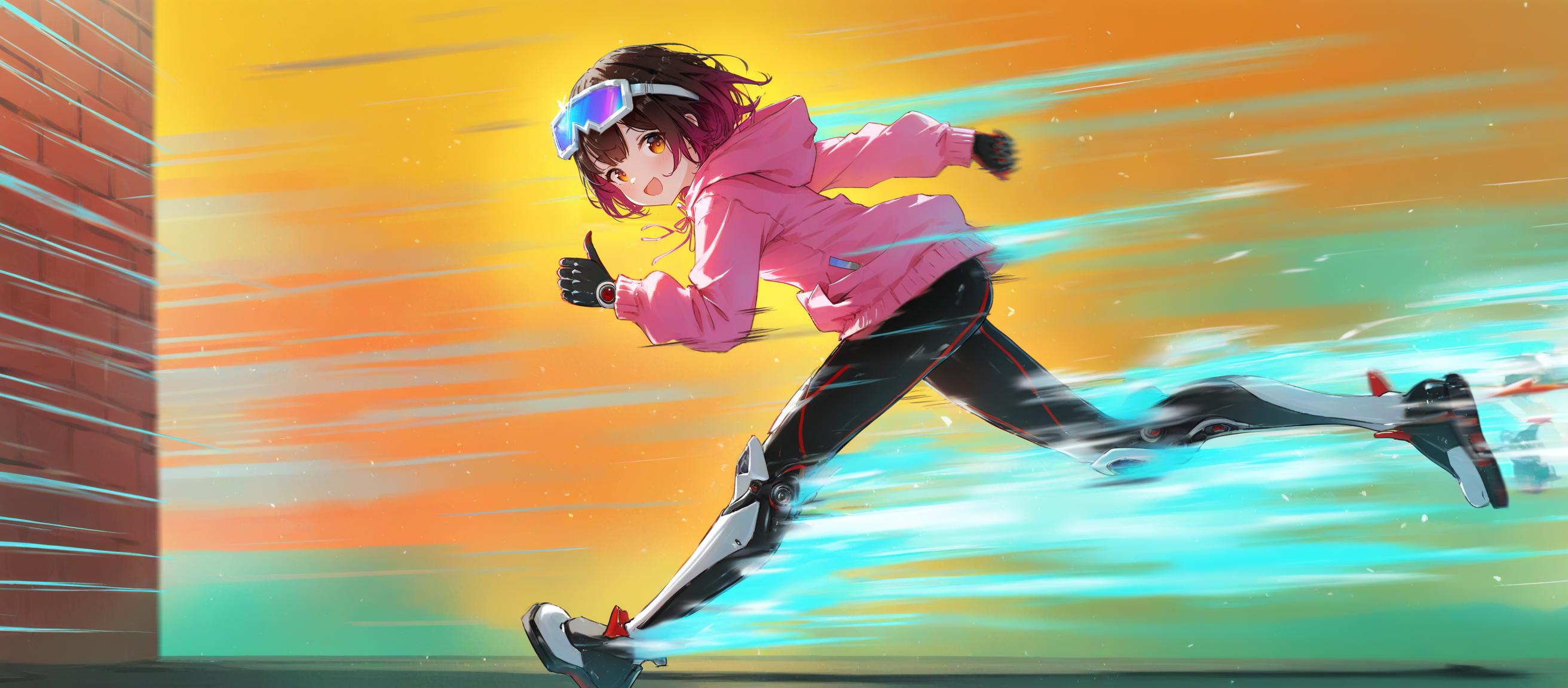 >>106550983Roboco running at extreme speed, surrounded by intense motion blur. She leaves glowing energy trails behind her, like comic book speedsters.The background is a blurred streak of orange, yellow and green that emphasize her speed and contrasts with her color palette.Perhaps this will finally make her look high-tech.