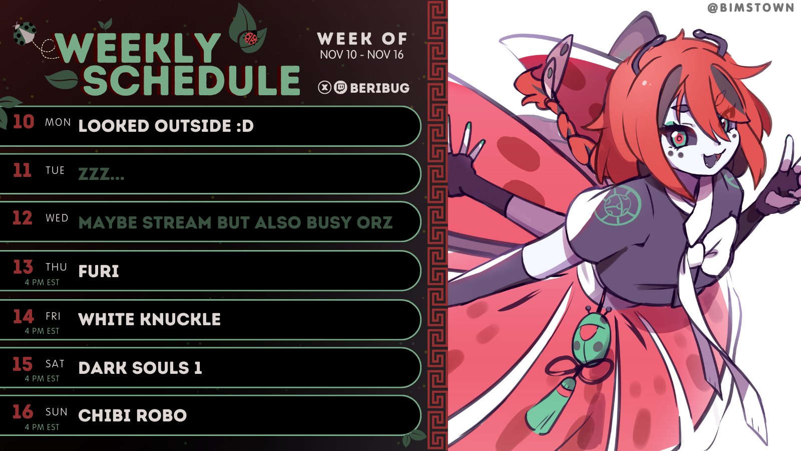 Bug Edition >What is /lig/?/lig/ is a thread for viewers to find, share, and discuss indie vtubers who have on average 500 viewers or more.>Why /lig/?Large indie vtubers have more net fans, but they are outnumbered by 2views by the thousands. This is a thread for the VIP, regardless of what language they stream on.>Can I shill my 499view oshi here?Considering averages fluctuate widely, all the way down to 100 is reasonable. The minimal requirement however is being Twitch partner or the YouTube equivalent in numbers.>Wait isn't that one a corpo?/lig/ is a thread for chuubas of a decent size who aren't defined by their corporate branding, either due to the small size of the corporation or the independence and lack of oversight granted to the talents>/lig/ Numbershttps://lignumbers.neocities.org/>Twitch Clips Guidehttps://pastelink.net/34vd5>VOD Archival Guidehttps://rentry.org/Vod_Archival_Guide>/lig/ VOD Archivehttps://rentry.org/Indie_Vod_Archives_lig>Koikatsu cardshttps://mega.nz/folder/JYtkXJwL#07gAQCQqI_9FsmX9oQJKSA>/lig/ Wheel of Nameshttps://wheelofnames.com/49w-z2x>Tiermakerhttps://tiermaker.com/create/-lig--16586688-3>/lig/ Chuuba Birthday Calendar (WIP)https://www.canva.com/design/DAE-XgWodVg/ofLz4QC1yPPQ4T6TTAE0fw/edit?utm_content=DAE-XgWodVg>Upcoming BirthdaysNovember 17th - RummyNovember 24th - Layna LazarNovember 27th - DashducksNovember 29th - FanguuNovember 30th - InisleinDecember 8th - FroggylochDecember 10th - VeibaeDecember 11th - NihmuneDecember 18th - Selkie>OC material for the OPhttps://mega.nz/folder/IIVD1IaJ#cfsRhWdJvzneIoG8HZUPuw>Duckshttps://www.twitch.tv/dashducks (embed) (embed) (embed) (embed)Other useful threads:>>>/vt//big/>>>/vt//corpo/>>>/vt//choc/>>>/vt//flip/>>>/vt//haha/>>>/vt//indie/>>>/vt//mint/>>>/vt//swarm/>>>/vt//vrt/>>>/vt//xvsj+/Previous Thread: >>106581716