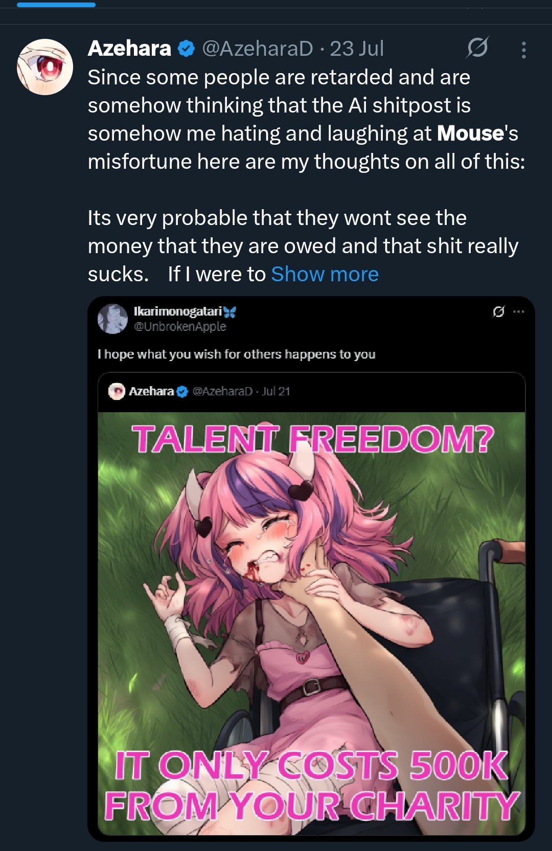 >>106594055looks obvious that he was trying to create an image that looks like "this is how theyre screwing over your oshi, that's how bad they are"but yeah, takes a humongous lack of awareness to use AI to make it in a community that hates AI, and then to create an overly violent and insensitive imagery of ironmouse that nobody would want to see, and then to layer text over it in a meme-like format as if you're being opportunistic about using the incident to create "content"people dont think enough about how their actions come off to others