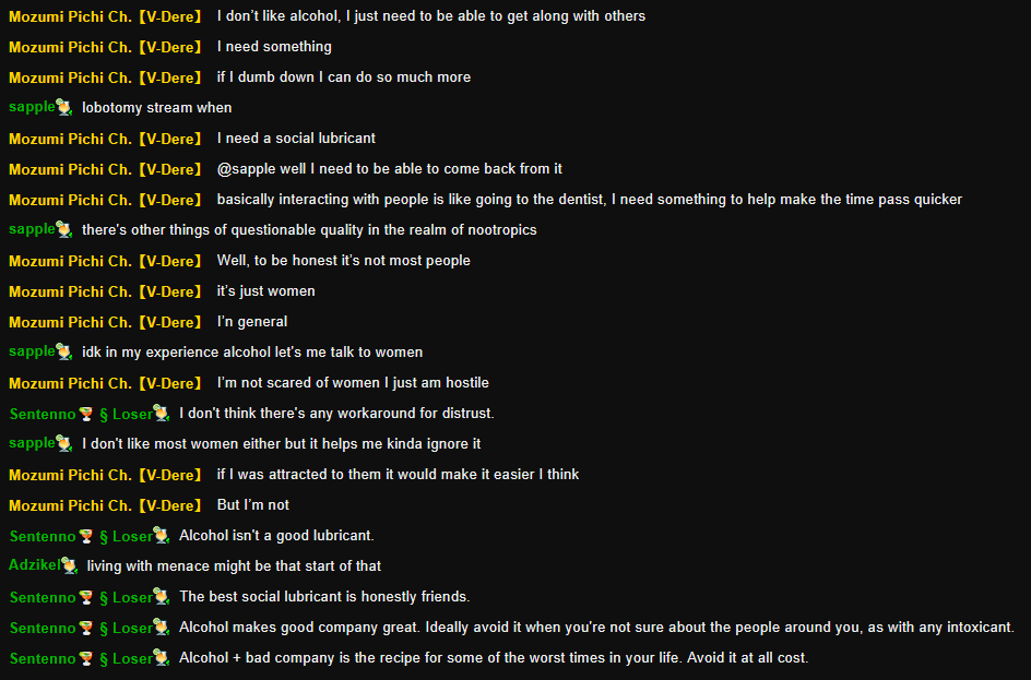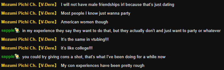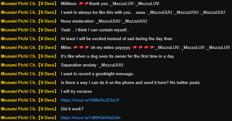 >I don't treat chat like my boyfriend, because when I get one, I don't want to have to break up with my chatMikan is too honest for her own good. I'm starting to understand the state of her viewership.