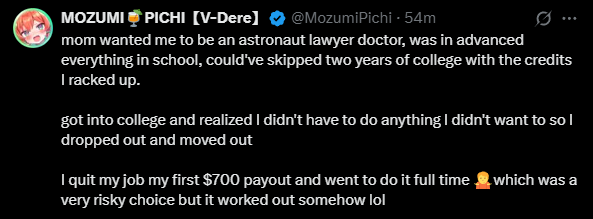 >>106617442That's not all it is though. And you guys act as if a vtuber not prioritizing money and donations over everything she's an awful person, it's nonsensical. Shouldn't this behavior be praised? Maybe some people just want to have fun and treat it as a hobby, not some grift to squeeze as much as they can from their audience.