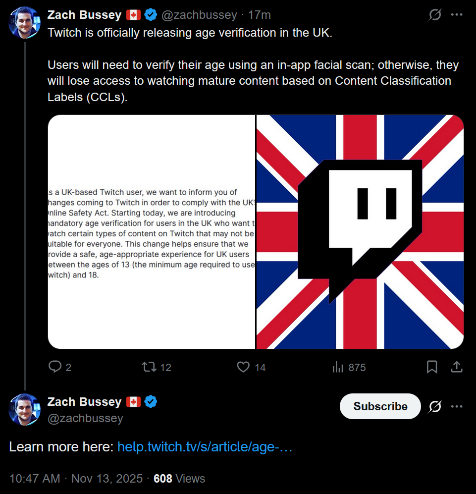 >>106627238Twitch has officially rolled out mandatory age verification for all United Kingdom residents. People who choose not to verify will be barred from watching channels with the following Content Classification Labels:>Sexual Themes>Drugs, Intoxication, or Excessive Tobacco Use>Violent and Graphic Depictions>Gamblinghttps://x.com/zachbussey/status/1988997127062597918https://help.twitch.tv/s/article/age-verification