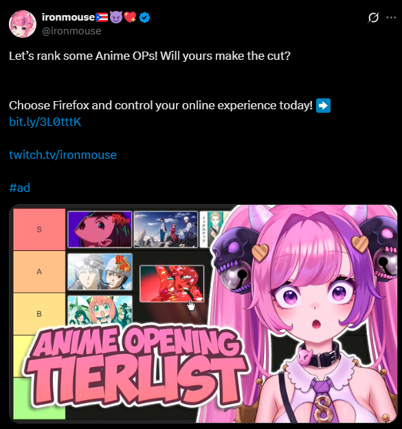 I wonder if she'll do another tier list today? It seems she's sponsored by Firefox again SHE HATES VEI