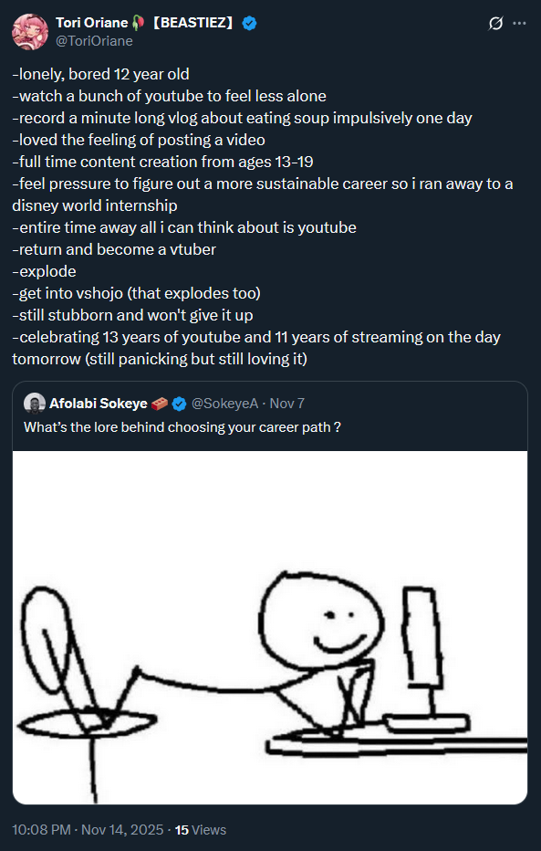 >>10668048813 years of content creation starting at 12 years old with 11 years of streaming so that'd be 14 years.
