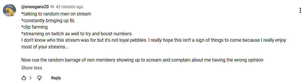 >>106689168Saying shit like "she's clip farming" and "She's doing it for the numbers" means the entire thing is in bad faith, yes.