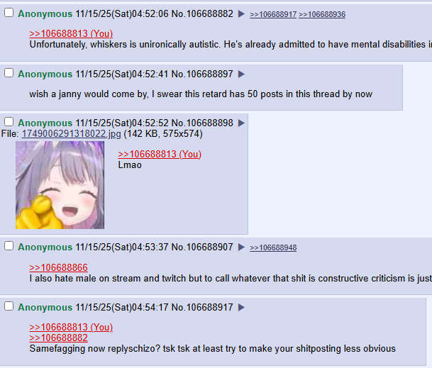 >>106696646This. The person using replyschizo for everyone replying to his melty was neckwhiskers or whatever the fuck his name is