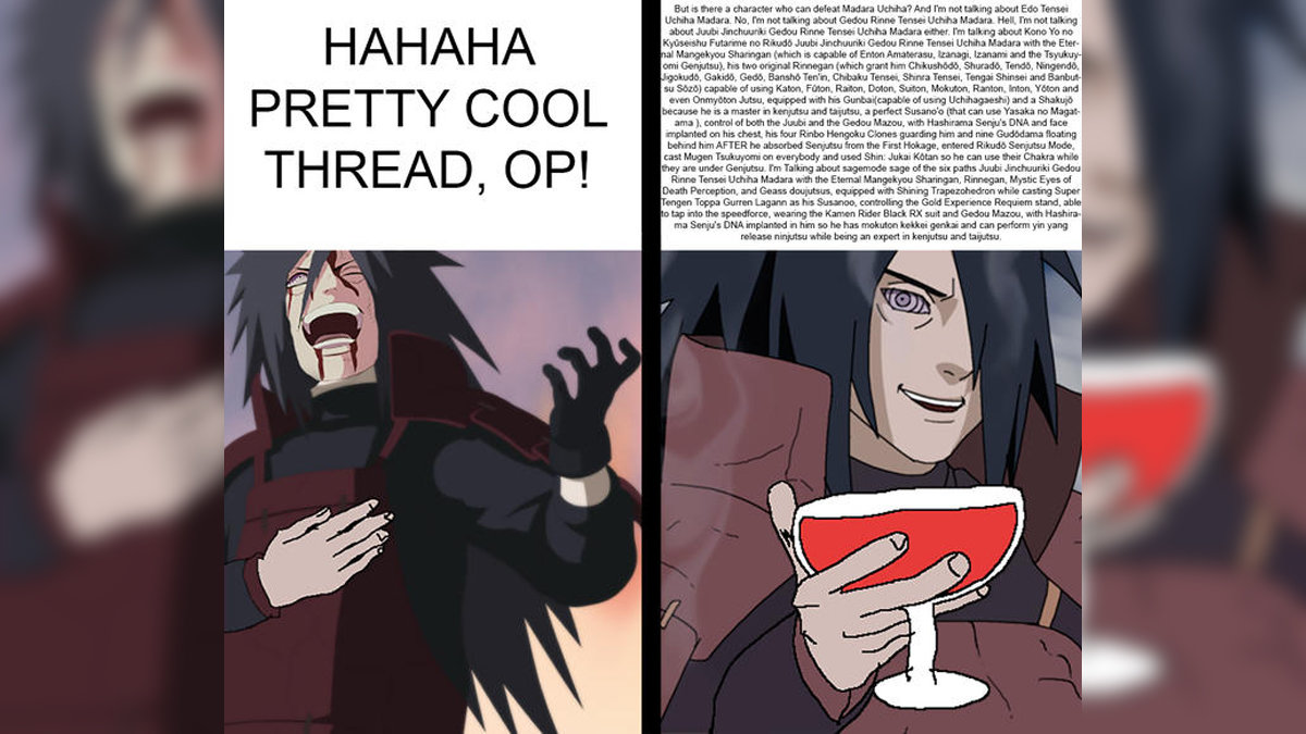 >>106699031Is there a vtuber stronger than Matara Uchiha?And I'm referring to Rinne Tensei Matara Uchiha with the Eternal Mangekyou Sharingan and Rinnegan doujutsus (with the rikidou paths ability) equipped with his Gunbai and control of the juubi and Gedou Mazou, a complete Susano'o, with Hashirama Senju's DNA implanted in his chest so he can perform Mokuton kekkei genkai and yin-yang release ninjutsu as well as being extremely skilled in taijutsu and bukijutsu.