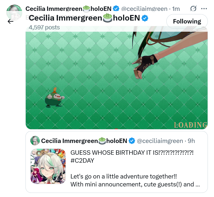 The 638th Wind-Up>NEXT STREAM: 【BIRTHDAY STREAM】let's go on an adventure...... !!!! #C2DAYhttps://www.youtube.com/watch?v=FoIYwP08UZw>LAST STREAM: Ragebaiting You 【Anime Edition】 (it's my birthday week so you can't be mad)https://www.youtube.com/watch?v=s9dl-aiXSck>Links:YouTube: https://www.youtube.com/@holoen_ceciliaimmergreenTwitter: https://twitter.com/ceciliaimgreenImportant Videos: https://rentry.org/ImmerMarks>Music:https://rentry.org/ImmerPiece【Hololive EN Justice】ABOVE BELOW- https://www.youtube.com/watch?v=ilLEj-SCCn8【Cover】 Forgotten Words | 忘れじの言の葉 #歌ってみた - https://www.youtube.com/watch?v=twto2g0FwTQ【Hololive EN】Odyssey - https://www.youtube.com/watch?v=0wO8d70KSXw【ENReco Orisong】Oh Princess - https://www.youtube.com/watch?v=5x9ix5CGmoo【CCGG Cover】Naimononedari / ないものねだり - https://www.youtube.com/watch?v=Qq-fgjrc-uc【CCGG Cover】Turing Love / チューリングラブ - https://www.youtube.com/watch?v=hX_3P0TBGP4【Hololive EN】 All for One - https://www.youtube.com/watch?v=ok24HgzbeLs【Hololive EN Justice】RENEGADE - https://www.youtube.com/watch?v=xg6DUmRRXlw【Cover】nevermore / ネヴァモア -https://www.youtube.com/watch?v=FZkkGB2bUyo【Original Song】Wind-Up - https://youtube.com/watch?v=Kqh6-vjars8>Merch:https://rentry.org/ImmerMerchHoloPro: https://shop.hololivepro.com/en/collections/ceciliaimmergreenGeekJack: https://shop.geekjack.net/pages/hololive>Tags:#ImmerScreen (Stream) https://twitter.com/hashtag/ImmerScreen#Immergination (Art) https://twitter.com/hashtag/Immergination#ImmerPiece (Music) https://twitter.com/hashtag/ImmerMusic#ImmerMemes (Memes) https://twitter.com/hashtag/ImmerMemes>/grün/ OP Template:https://rentry.org/ImmerTemplate>Previous Thread: >>106645086