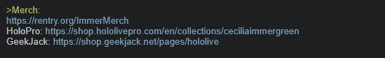 >>106712188>>106712190thanks,but oh! I thought about including those links under the merch part of the OP but since we got these >>106706222>Merch:>https://rentry.org/ImmerMerch>HoloPro: https://shop.hololivepro.com/en/collections/ceciliaimmergreen>GeekJack: https://shop.geekjack.net/pages/hololivemaybe it's not needed, huhand I'm not rentrytomo so I'll leave that to him>>106712143>Wherejust a afk a bit but wanted to prepare the next bread so the thread doesn't die and bakertomo doesn't have to bake from the phone