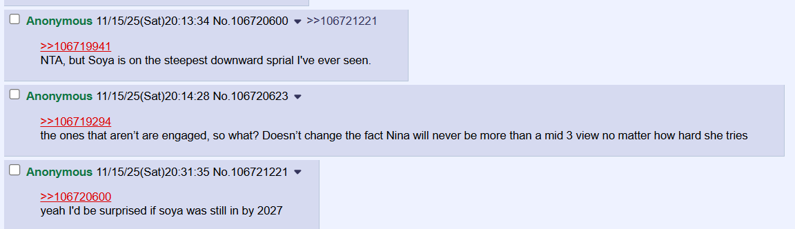 >>106725450Soya is CC, they dislike her joining hololive and they are convinced she'll graduate as soon as possible after holofes.