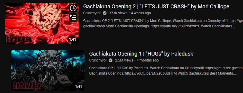 >>106763943The creditless version is about to be passed up on the official Gachiakuta channel though. I think that one on crunchyroll's channel jstu had the benefit of being the first thing uploaded.