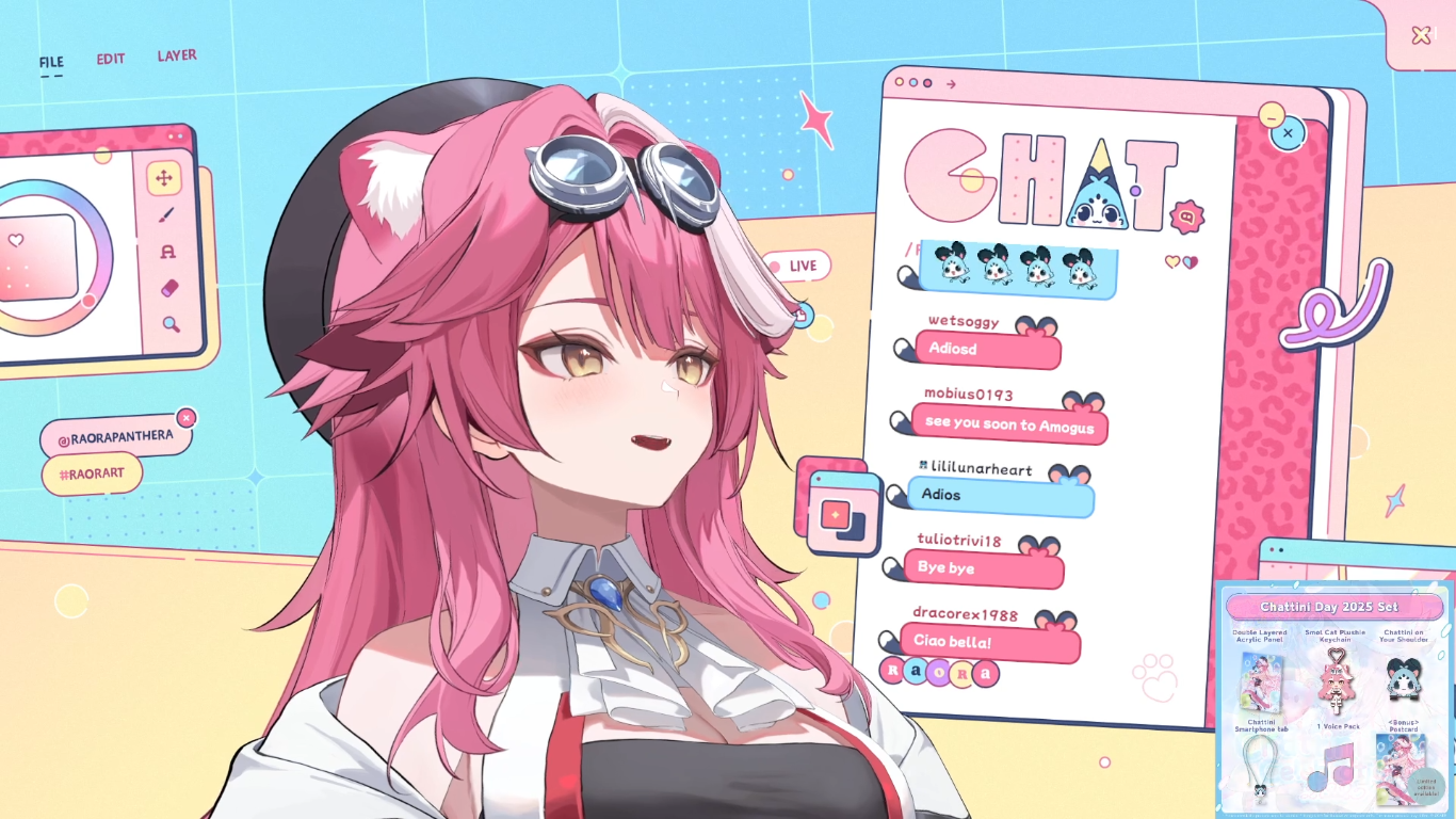 Thread for the pon, cute, hardworking artist mamma (and pizza with french fries addict), italian pink gatta.>Channel:https://youtube.com/@holoen_raorapantherahttps://www.twitch.tv/raora>X:https://x.com/raorapanthera>Last Stream:>【MEMBERS ONLY】Drawing today, but my Chattini are here to keep me company https://www.youtube.com/watch?v=vH1eftN-kBc>Next Stream:>【Escape Simulator】Braincells escape simulator w/ Rikku! https://www.youtube.com/watch?v=TC1JExhTddc>Original Songs:>ABOVE BELOW【hololive English -Justice- Debut Song】【Original】 https://www.youtube.com/watch?v=ilLEj-SCCn8【Eurobeat ver.】 https://www.youtube.com/watch?v=GXCLPN_RBHE【Far East ver.】 https://www.youtube.com/watch?v=QDhCNXYgdJc>Odyssey -【hololive English - Original Song】 https://www.youtube.com/watch?v=0wO8d70KSXw>RENEGADE【hololive English -Justice- 2nd Original Song】 https://www.youtube.com/watch?v=xg6DUmRRXlw>All for One -【hololive English - Original Song】 https://www.youtube.com/watch?v=OgX_6uTZg9w>Gacha×Gacha ADVENTURE! - Raora Panthera【Original Song】https://www.youtube.com/watch?v=1BTd20qIfBI>Covers:>HIBANA / ヒバナ -【Raora Panthera】https://www.youtube.com/watch?v=UwIhbV_wuKI>ECHO -【Raora Panthera】https://www.youtube.com/watch?v=pqqhKj6Sh-E> マトリョシカ (Matryoshka) -【Raora Panthera x Gigi Murin】 https://www.youtube.com/watch?v=ILpEFrK1F5I>Snow Halation -【hololive English -Justice-】 https://www.youtube.com/watch?v=tBzZss_kh_0>Lore and Debut:https://www.youtube.com/watch?v=n4oH-SK2Shohttps://www.youtube.com/watch?v=JW7j8tKMOfY>Merch:https://shop.hololivepro.com/en/pages/search-results-page?q=raora>Fanarts:https://x.com/hashtag/RaorArthttps://x.com/hashtag/Chattinohttps://www.pixiv.net/en/tags/ラオーラ・パンテーラ>Divegrass:https://implyingrigged.info/wiki//justice/>/ciao/ OP Template:https://rentry.org/ciaotemplate>/ciao/ Archive:https://mega.nz/folder/PEswSJKa#9Q8P4U2c4VhUXnCp2H5SmQ>Previous Thread:>>106624572