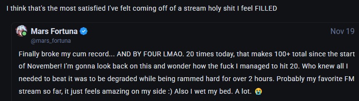 >>106861194As someone who's spoke to Ruru (before she went all in on lewd) you would be surprised. For some reason she's very obsessed about loyalty despite hopping on the first girl that gives her attention, actively sabotaging her earnings by either throwing fits or telling people not to send money cause it's useless.You could be on your best behaviour and she'll crash out because you replied and said hi to someone. She would make infinitely more money if she shut the fuck up, everything you see is just her being menhera and never learning