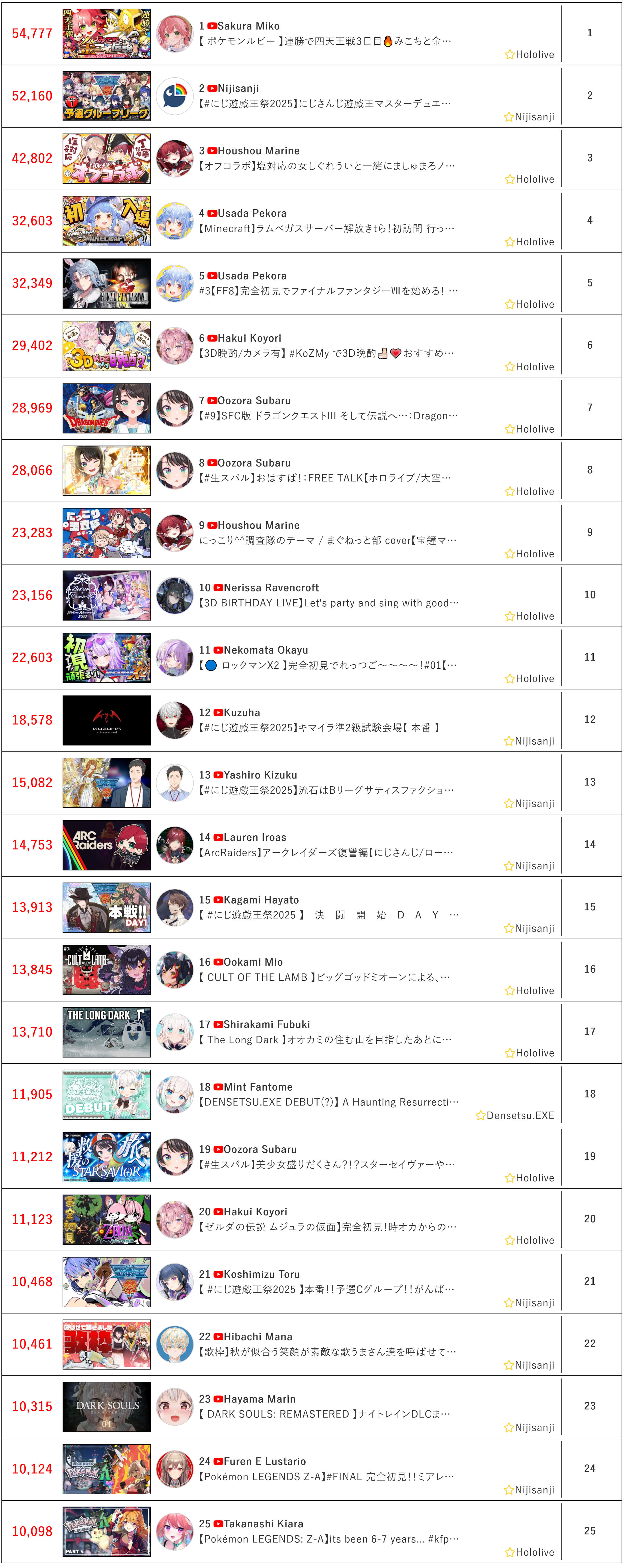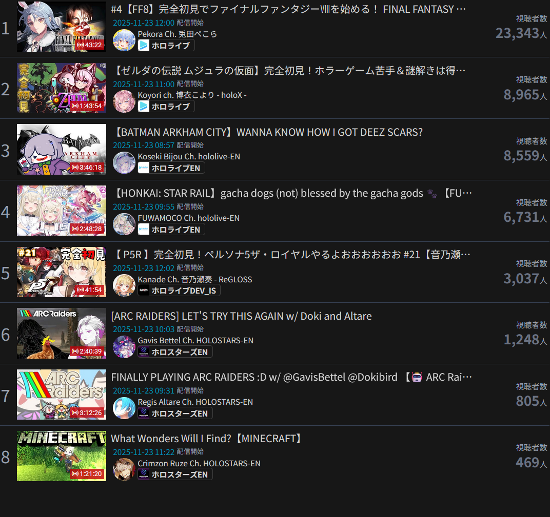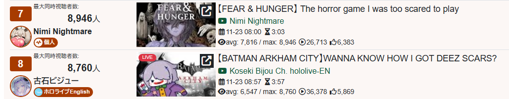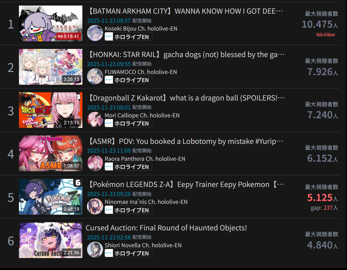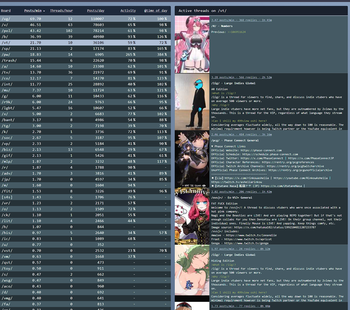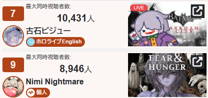 >>106960392*GENERAL NUMBERFAG SITES*>https://playboard.co/en/>http://ikioi-ranking.com/>https://vrabi.net/>https://www.vstats.jp>https://live-ranking.userlocal.jp/vtuber-ranking>https://vt.poi.cat/Hololive sites>https://www.hololyzer.net/youtube/index.html>https://trackholo.live/en/>https://holo-spotify-stats.jirikunes.eu/Twitch sites>https://sullygnome.com/>https://twitchtracker.com/>https://stats.roki.sh/>https://streamscharts.com/
