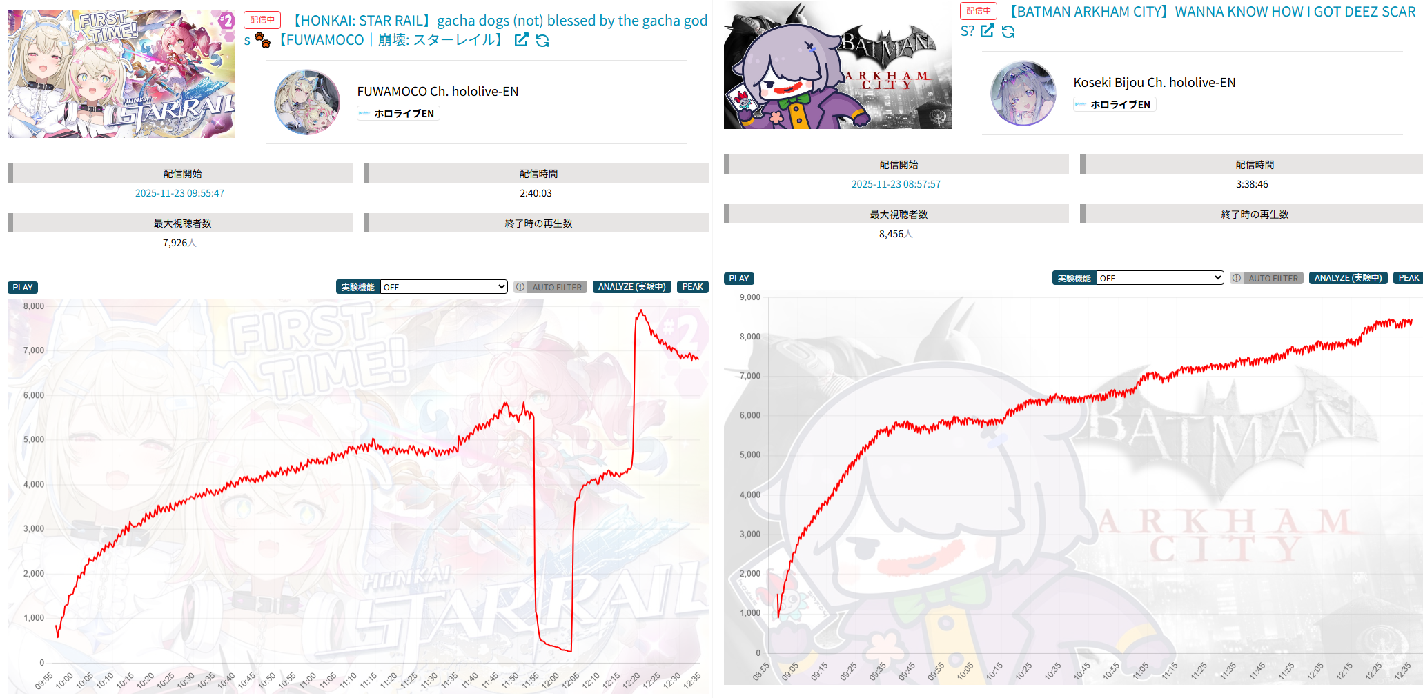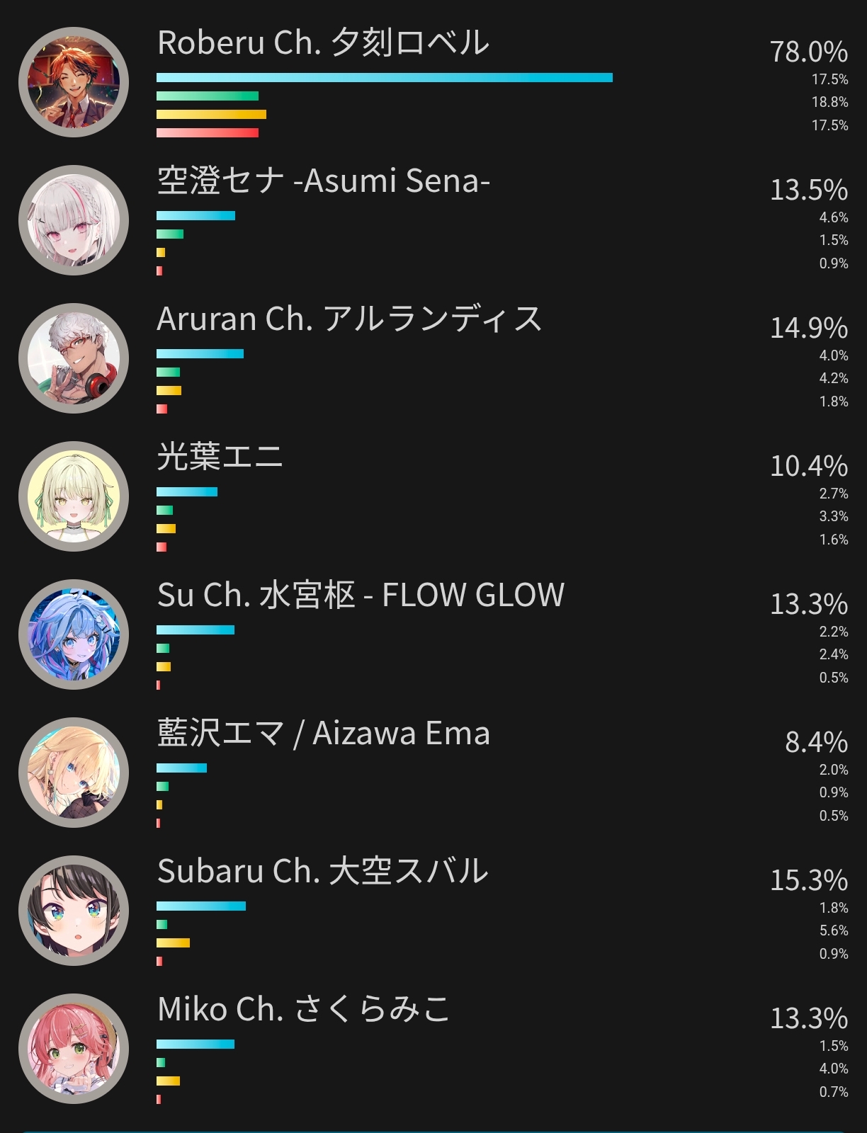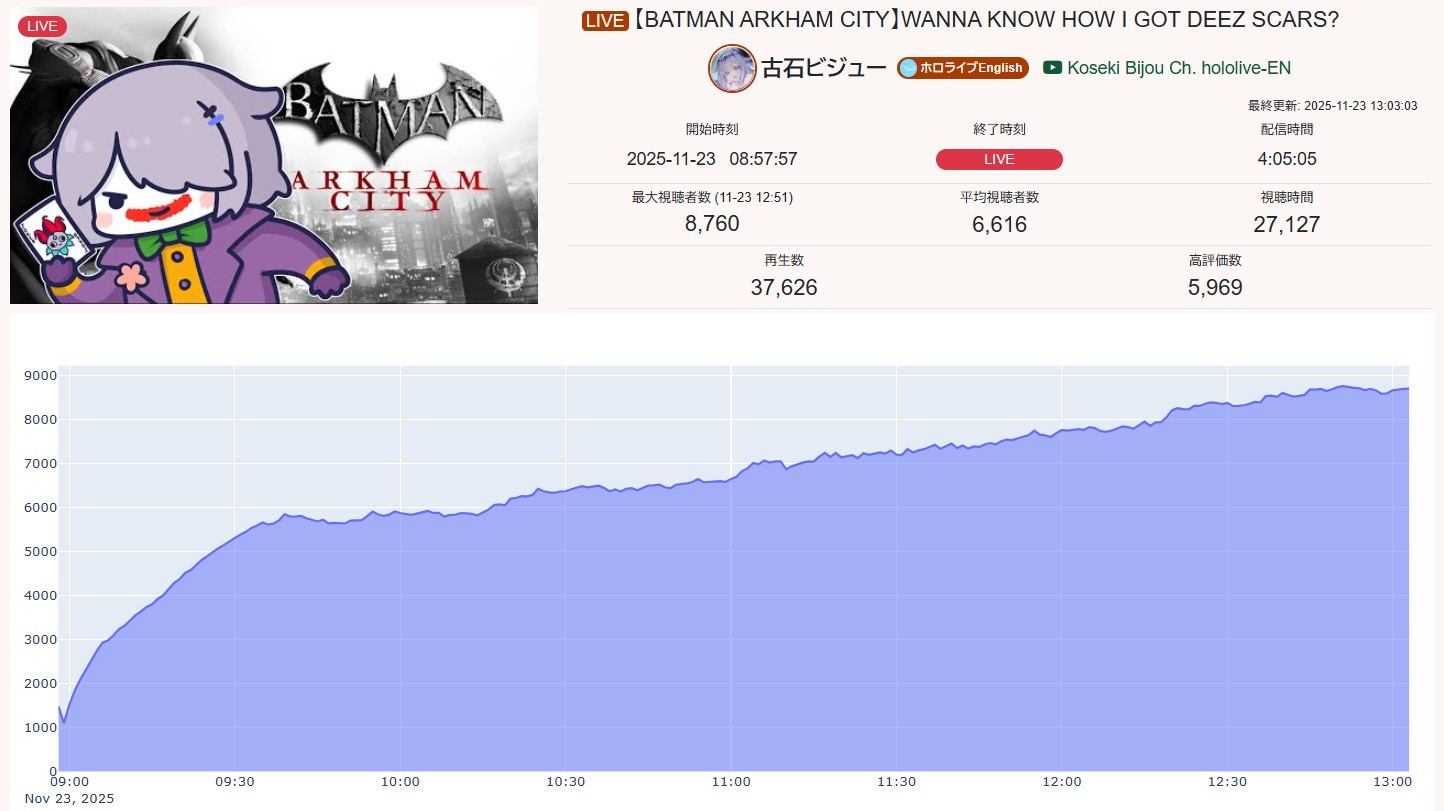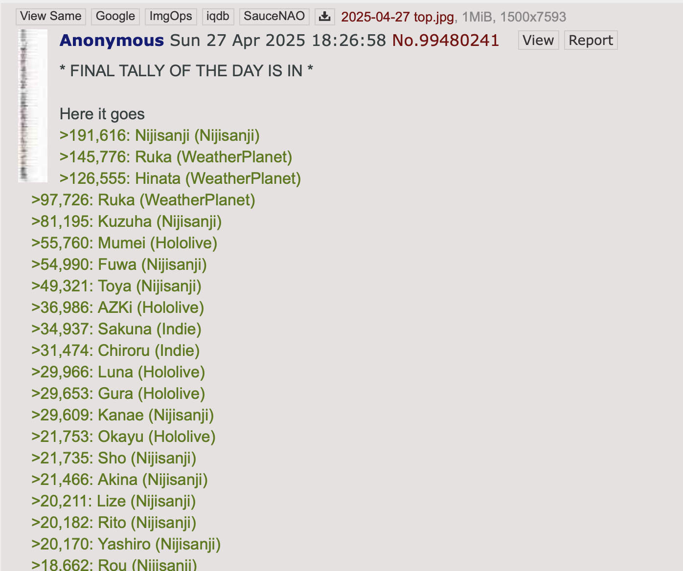 >>106960392*GENERAL NUMBERFAG SITES*>https://playboard.co/en/>http://ikioi-ranking.com/>https://vrabi.net/>https://www.vstats.jp>https://live-ranking.userlocal.jp/vtuber-ranking>https://vt.poi.cat/Hololive sites>https://www.hololyzer.net/youtube/index.html>https://trackholo.live/en/>https://holo-spotify-stats.jirikunes.eu/Twitch sites>https://sullygnome.com/>https://twitchtracker.com/>https://stats.roki.sh/>https://streamscharts.com/