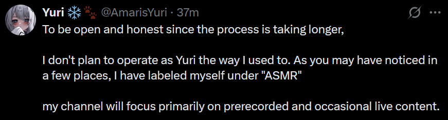 >>106964870If that's the reason she could sue Sakana/Phase unless she did it using her official account because regardless of what a contract says Canadian labor laws would never allow an organization to own your personal life 24/7 (I see the can't talk to fans 1on1 or date them clause referenced all the time and it's also bullshit if tried)