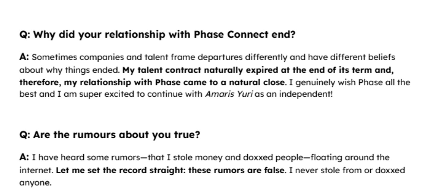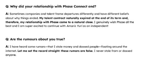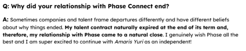>>106964644That part is true, her contract did run out. Not sure how new you are but the Phase girls are pretty open about when their renewal period isNow the question that she's very clearly dodging is why the contract wasn't renewed but hey she didn't lie, she just acted like a fey