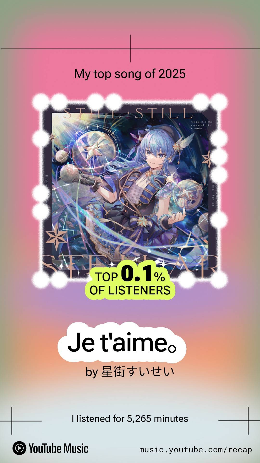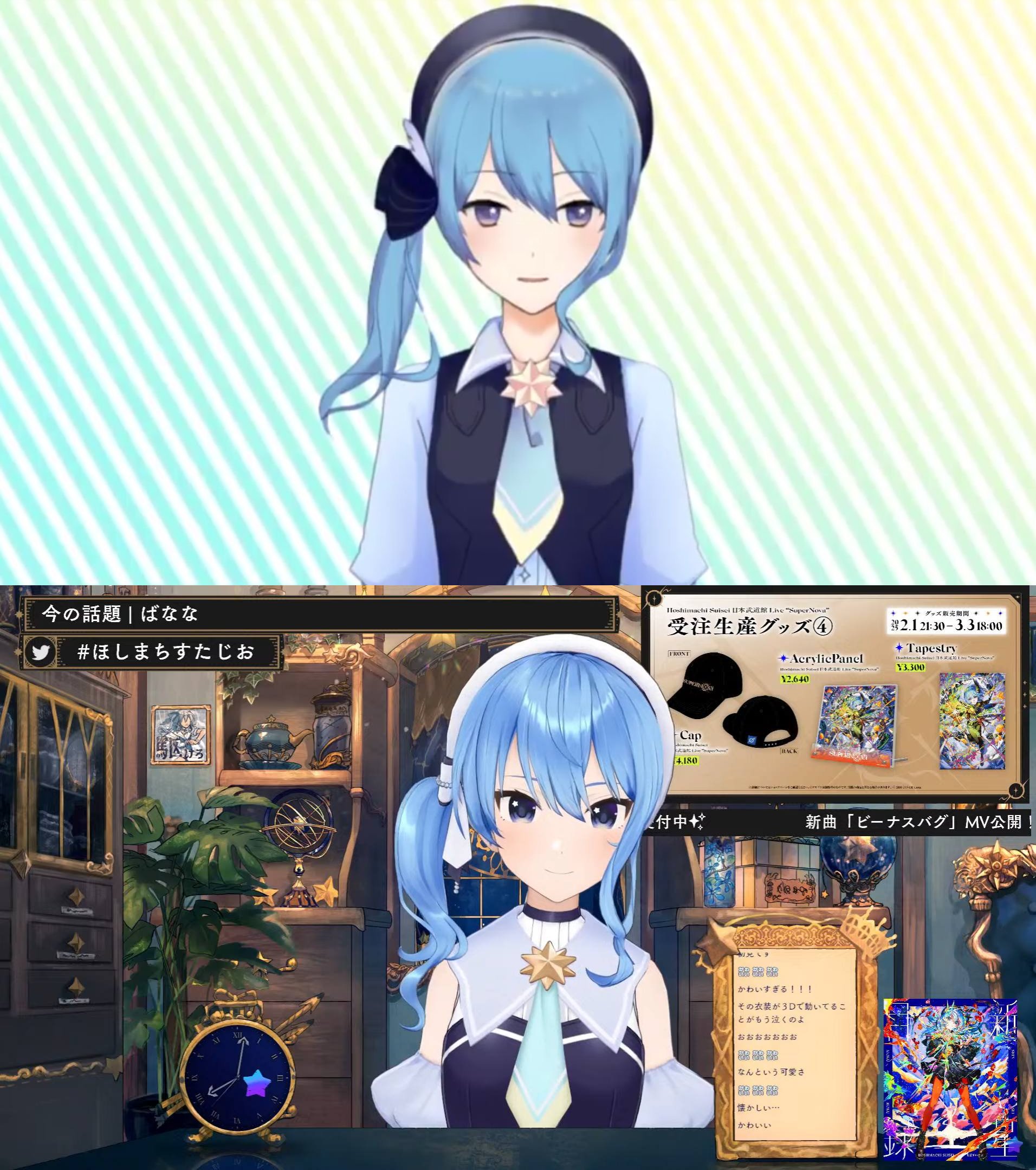 >Latest songsGoing My Way (AS_tar)https://files.catbox.moe/79092s.mp4仮装狂騒曲 / Kasoukyousoukyoku (Cover ft. Shigure Ui, KAF)https://www.youtube.com/watch?v=FCprxX-V9M8Lollipop (miComet)https://www.youtube.com/watch?v=Jz2SeJDfml8>Youtube Channel + Playlists (Original MVs, Covers, Collab songs, Etc.)https://www.youtube.com/@HoshimachiSuisei/playlists>Twitterhttps://twitter.com/suisei_hosimati - https://twitter.com/suisei_submatihttps://pastebin.com/Jp67bL4F (Twitter music-related uploads)>月に向かって撃て / MoonshotBuy the album [01.26]https://cover.lnk.to/TsukiNiMukatteUte>新星目録 / Shinsei MokurokuBuy/stream the albumhttps://cover.lnk.to/SHINSEIMOKUROKU>SPECTERBuy/stream the albumhttps://cover.lnk.to/Suisei2ndAlbumShout in Crisis Blu-rayhttps://www.cdjapan.co.jp/product/HOXB-10012Vinyl https://cover.lnk.to/Specter_LP>Still Still StellarBuy the albumhttps://www.cdjapan.co.jp/product/HOLO-2Stellar Stellar (The First Take Ver.)https://www.youtube.com/watch?v=AAsRtnbDs-0Stellar into the Galaxy Blu-rayhttps://www.cdjapan.co.jp/product/HOXB-10006Vinyl https://merch-matome.com/still-still-stellar-lp/ >Midnight Grand OrchestraBuy/Stream the albumshttps://TF.lnk.to/MGO_Overturehttps://tf.lnk.to/MGO_Starpeggiohttps://tf.lnk.to/MGO_MidnightMission_BD>Upcoming events[02.21] Hoshimachi Suisei Live - SuperNova: REBOOThttps://supernova.hololivepro.comTicketshttps://supernova.hololivepro.com/tickets_en/>ExtrasSuisei x KAF Interviewhttps://pastebin.com/PJzL4XxbPieceshttps://www.youtube.com/watch?v=vcAuvl17sRsNow on Space (VILLS Ver.)https://streamable.com/nxvhlascrap & build ! (Shiraken's 1st EP)https://cover.lnk.to/scrapbuild>Music Space & NHK Radio (requires a VPN)https://www.nhk.or.jp/radio/ondemand/detail.html?p=7763_01https://www.youtube.com/@vr6843NHK Radio Archives / ぶいあーる: https://pastebin.com/Q8tBPxLKFor any questions you may have and older threads, check the FAQ:https://rentry.org/SuiseiThreadsAndFAQPrevious thread: >>106832732