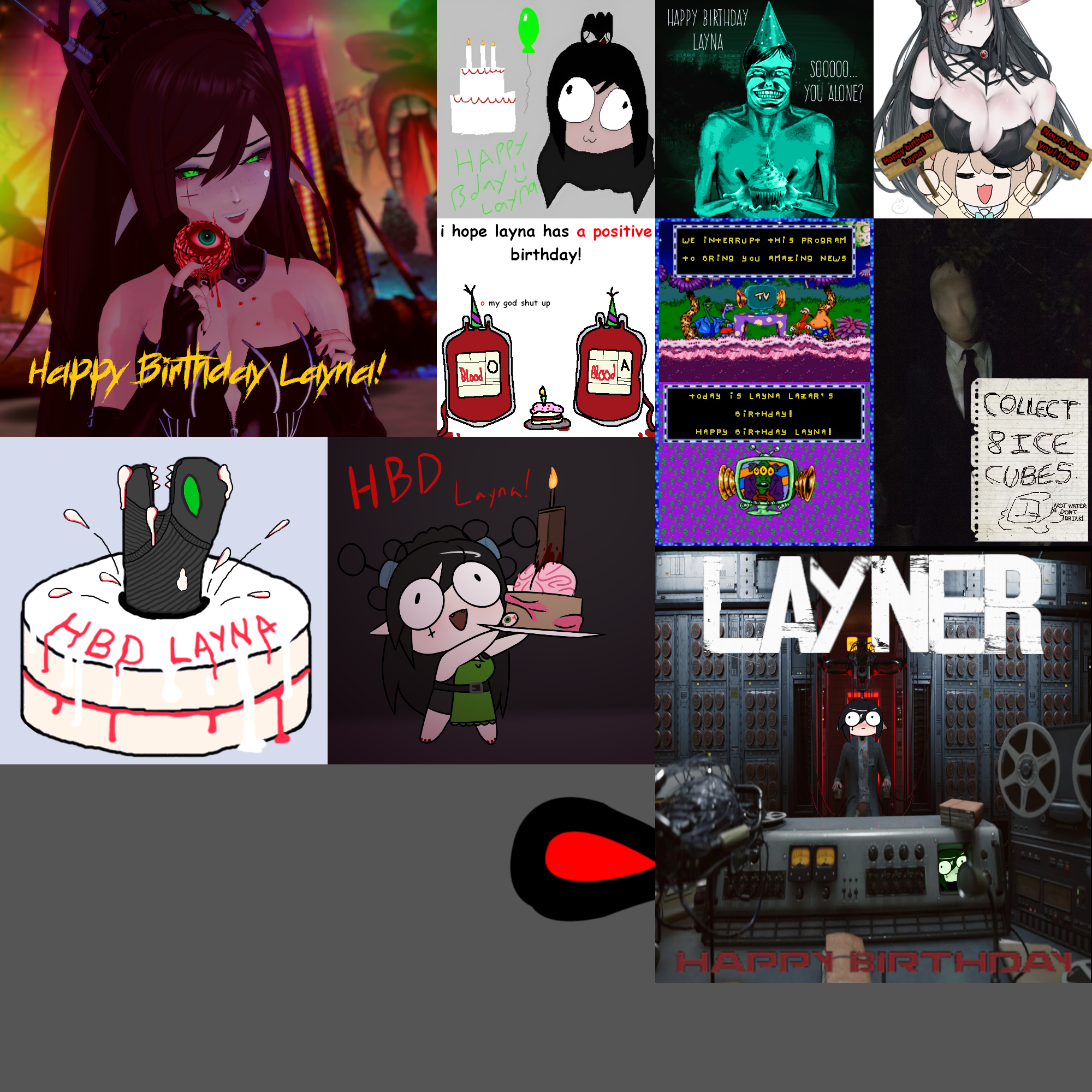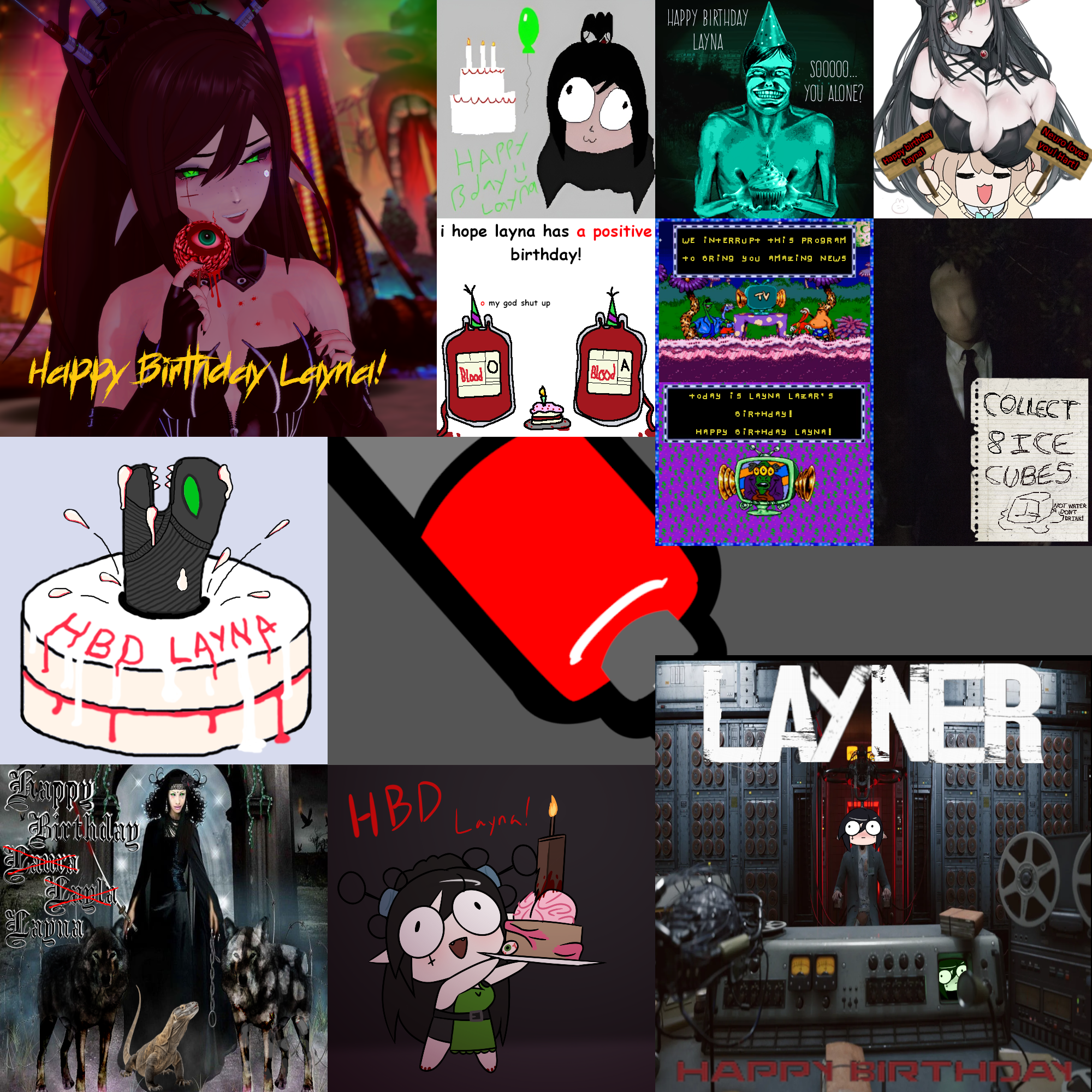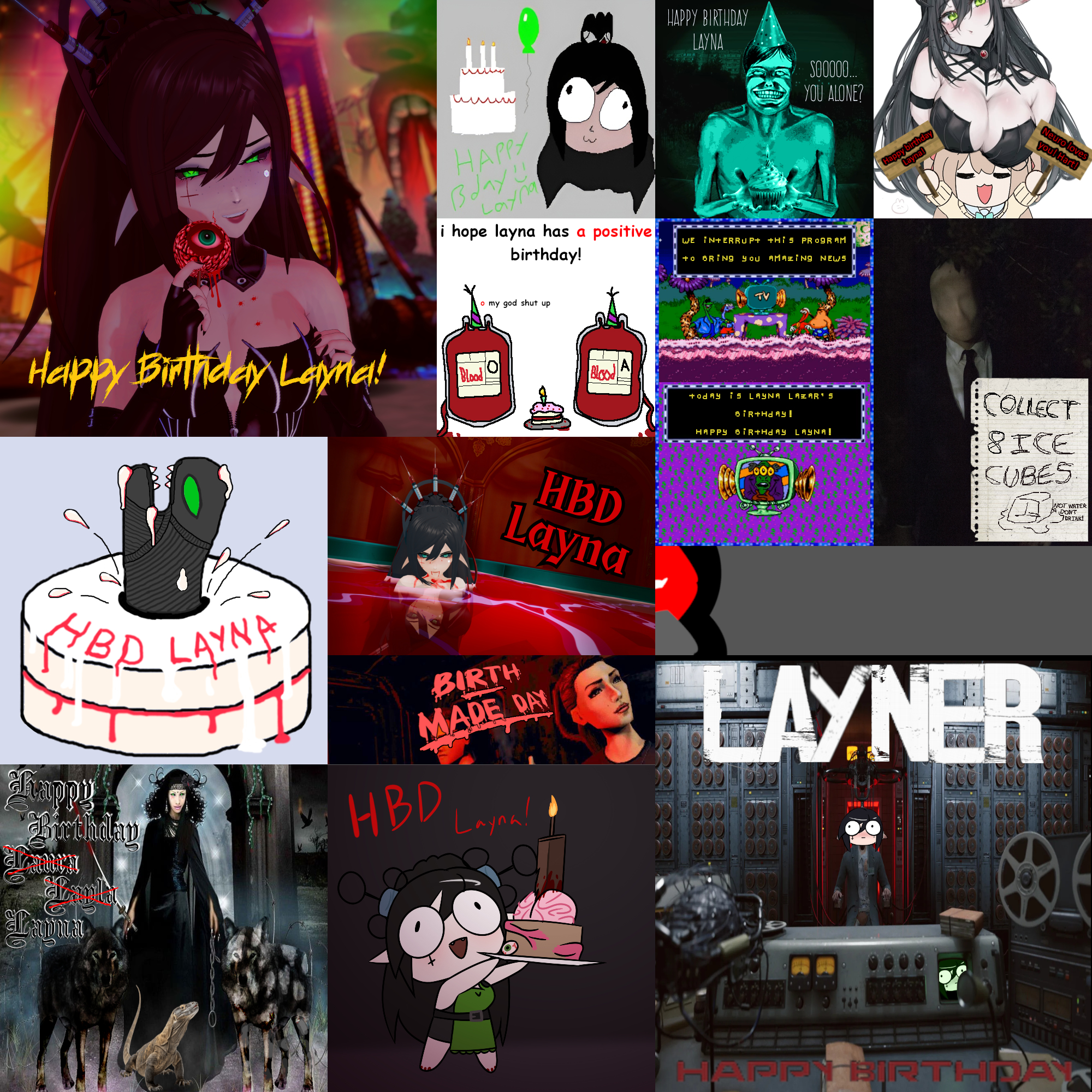 In less than 4 hours Layna will be turning 35, and you can show her some love with a tile! Submissions must be SFW and have image dimensions that are a multiple of 200 (200x200, 400x400, 200x400, etc).Some things Layna likes for inspiration:>All things horror, games and movies especially>Cooking, Dressing up, Retro SEGA games, dinosaurs>ARGs, Unfiction(Marble Hornets, School Rumors, Fake Documentary Q)>Her dogs Tui and TyrReference pics for the dogs, Tui is the black one and Tyr is the spotted one https://files.catbox.moe/jo7sb4.jpghttps://files.catbox.moe/purypu.jpgSome of her friends are:>Cotton, Heavenly, Eros, Vedal/Twins, Filian, Mini, Cerber, Nitya, Inis, OliviaHere are the model references https://mega.nz/folder/QrsngLYL#qZWmk-euDjd5mmdau_u5jABecause of New Zealand's time zone being 18-22 hours ahead of US time zones, the deadline for this card is going to be November 23rd at 12:00pm EST. This will put us at 6am the morning of Layna's birthday in her own time zone.